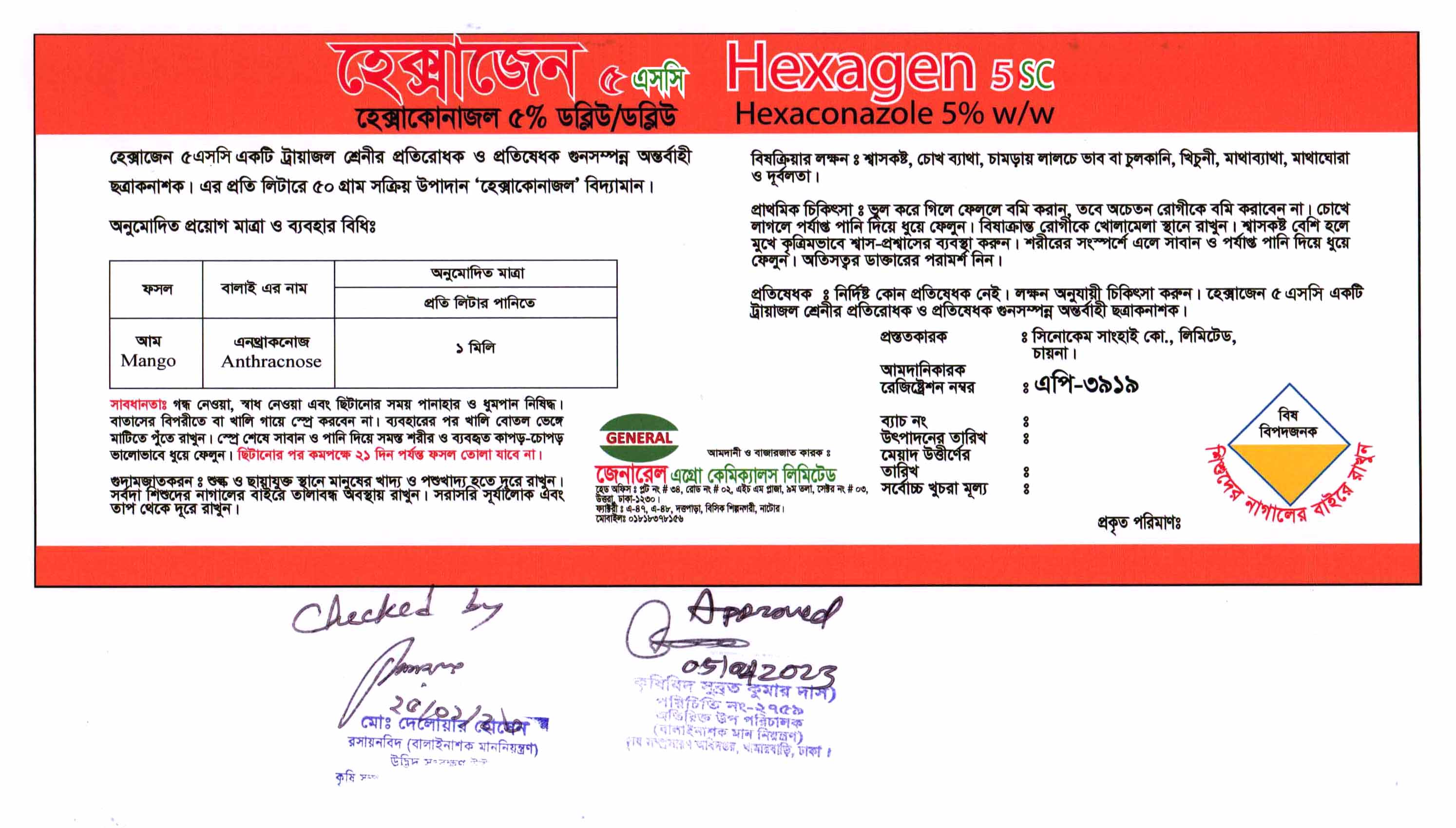 হেক্সাজেন ৫ এসসি একটি ট্রায়াজল শ্রেনীর প্রতিরোধক ও প্রতিষেধক গুনসম্পন্ন অন্তর্বাহী ছত্রাকনাশক। যা আমের এনথ্রাকনোজ দমনে উপযোগী।