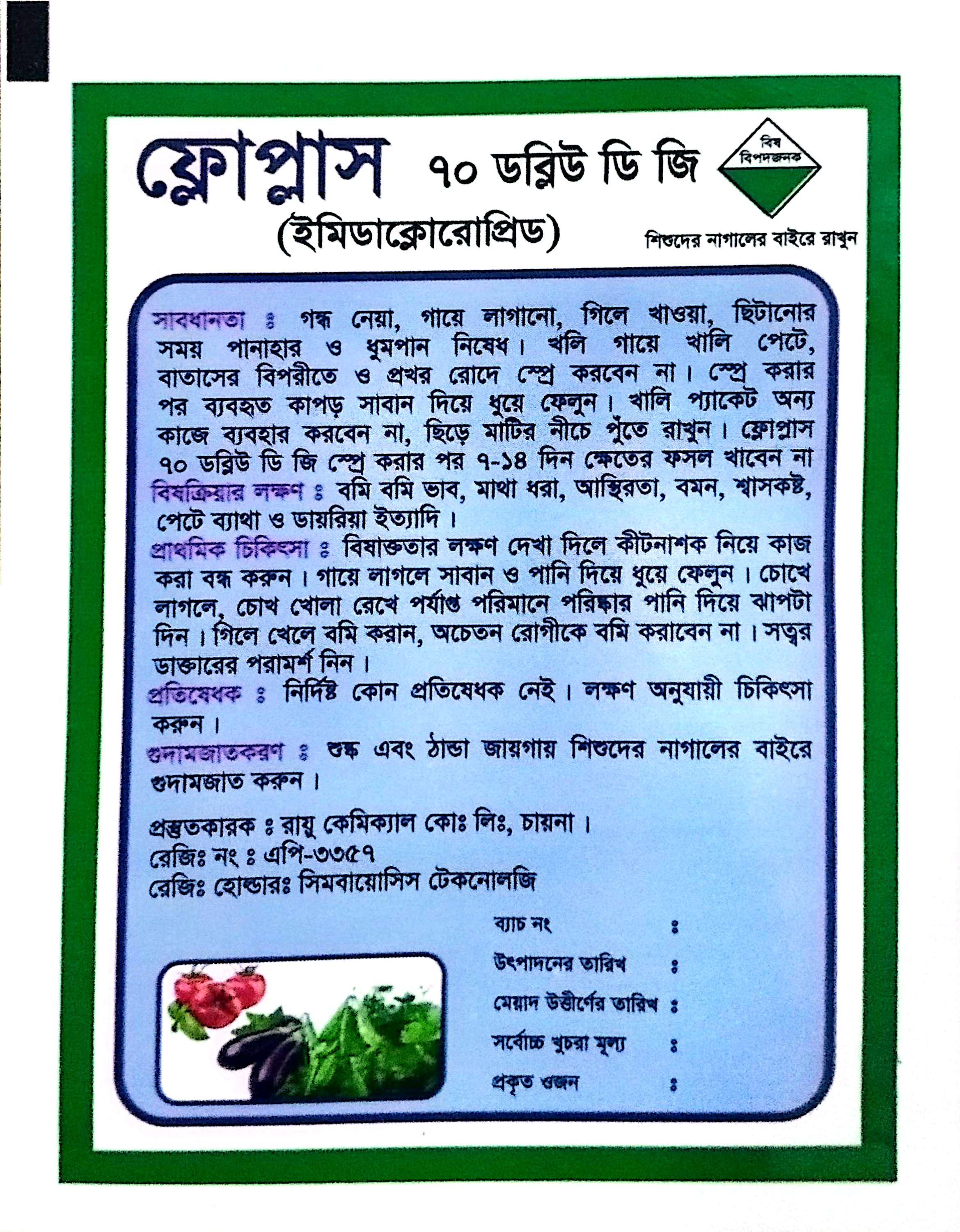 ১০ লিটার পানিতে ০৫ শতক জমির জন্য ফ্লোপ্লাস-৭০ ডব্লিউ ডি জি ০২ গ্রাম ভাল ভাবে মিশিয়ে স্প্রে করতে হবে।