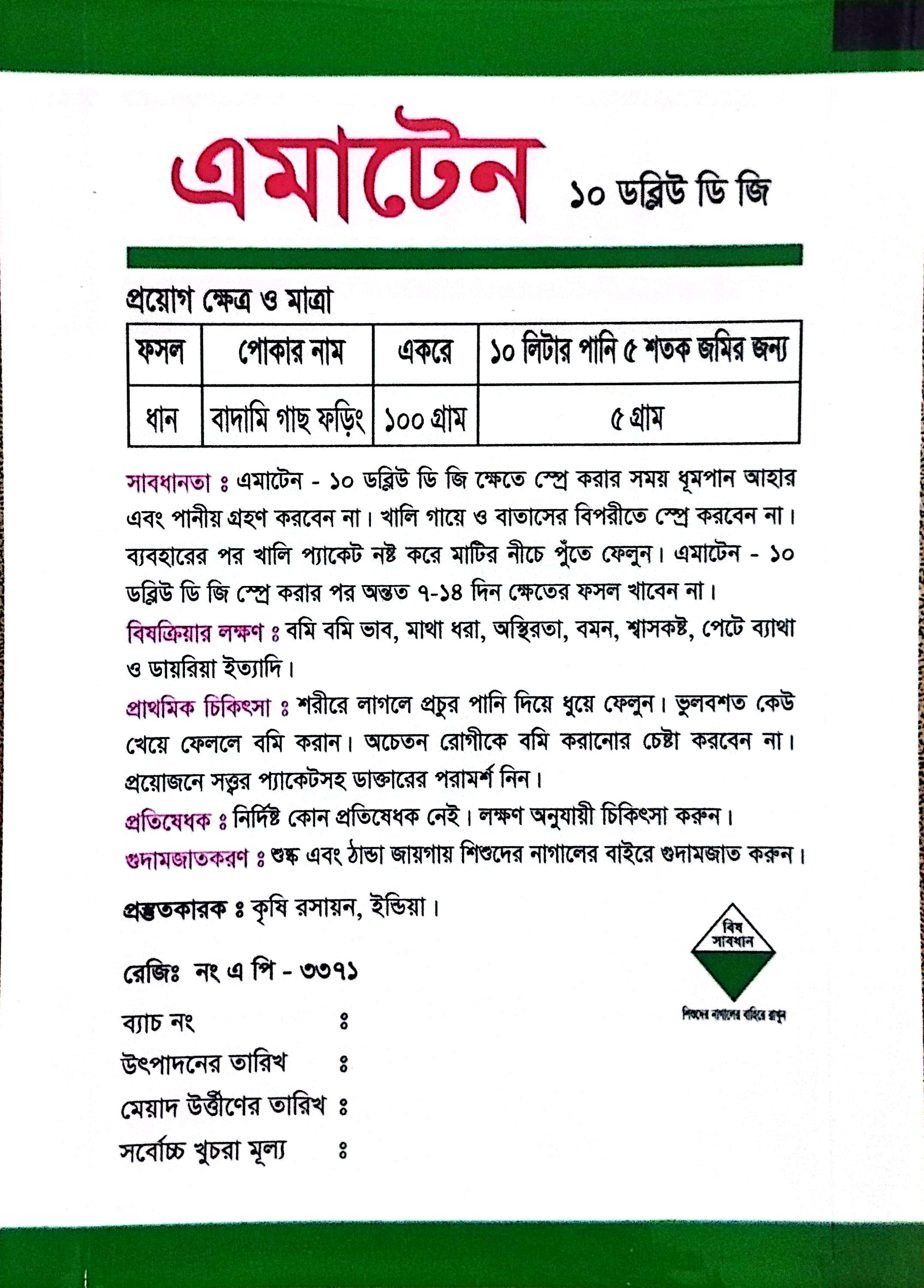 ১০ লিটার পানিতে ০৫ শতক জমির জন্য এমাটেন-১০ ডব্লিউ ডি জি ০৫ গ্রাম ভাল ভাবে মিশিয়ে স্প্রে করতে হবে।
