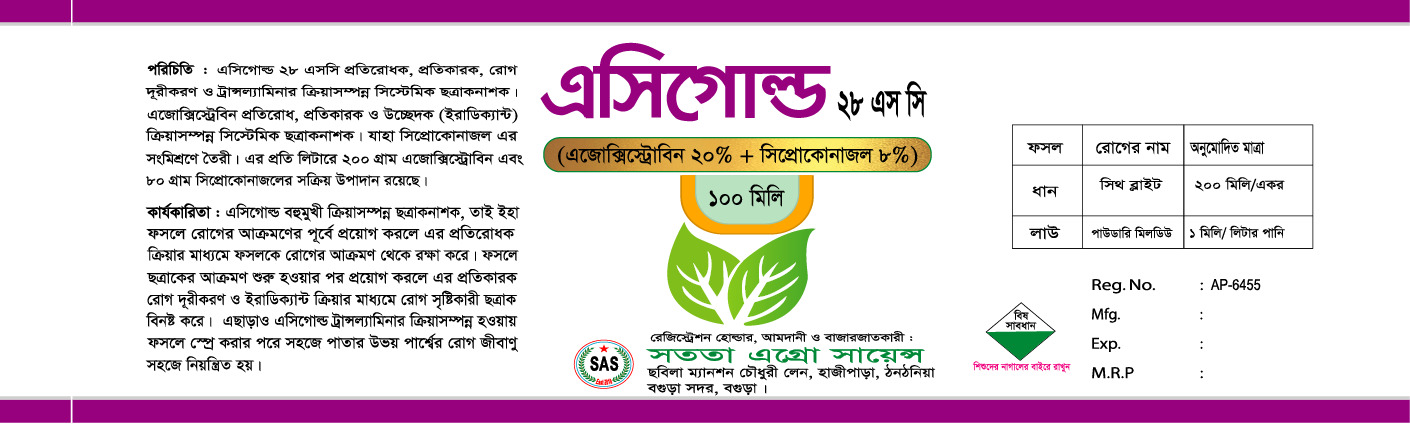 এসিগোল্ড বহুমুখী ক্রিয়াসম্পূর্ণ ছএাকনাশক। তাই ইহা ফসলে রোগের আক্রমনের পূর্বে প্রয়োগ করলে এর প্রতিরোধক ক্রিয়ার মাধ্যমে ফসলকে রোগের আক্রমণ থেকে রক্ষা করে। ফসলে ছএাকের আক্রমণ শুরু হওয়ার পর প্রয়োগ করলে এর প্রতিকারক রোগ দূরীকরণ ও ইরাডিক্যান্ট ক্রিয়ার মাধ্যমে রোগ সৃষ্টিকারী ছত্রাক বিনষ্ট করে।