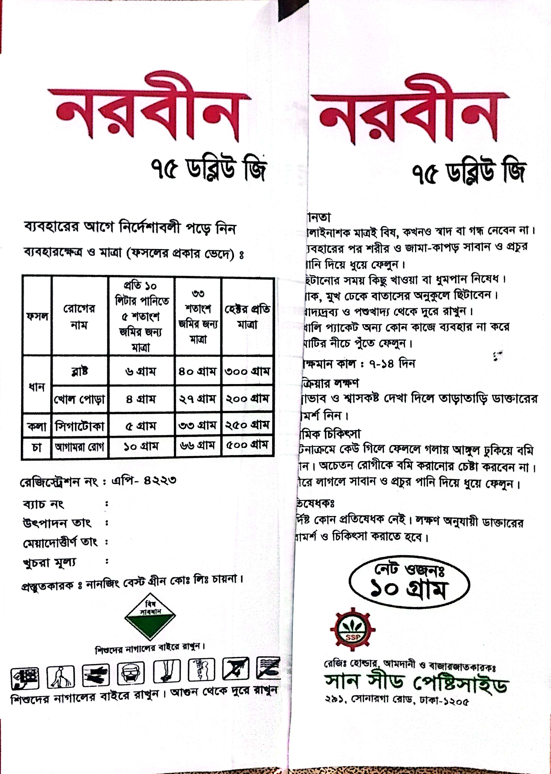 ১০ লিটার পানিতে ০৫ শতক জমির জন্য নরবীর-৭৫ ডব্লিউ জি ০৬ গ্রাম ভাল ভাবে মিশিয়ে ধানের ব্লাস্ট রোগের জন্য স্প্রে করতে হবে। ১০ লিটার পানিতে ০৫ শতক জমির জন্য নরবীর-৭৫ ডব্লিউ জি ০৪ গ্রাম ভাল ভাবে মিশিয়ে ধানের খোল পোড়া রোগের জন্য স্প্রে করতে হবে। ১০ লিটার পানিতে ০৫ শতক জমির জন্য নরবীর-৭৫ ডব্লিউ জি ০৫ গ্রাম ভাল ভাবে মিশিয়ে কলা সিগাটোকা রোগের জন্য স্প্রে করতে হবে। ১০ লিটার পানিতে ০৫ শতক জমির জন্য নরবীর-৭৫ ডব্লিউ জি ১০ গ্রাম ভাল ভাবে মিশিয়ে চায়ের আগামরা রোগের জন্য স্প্রে করতে হবে।