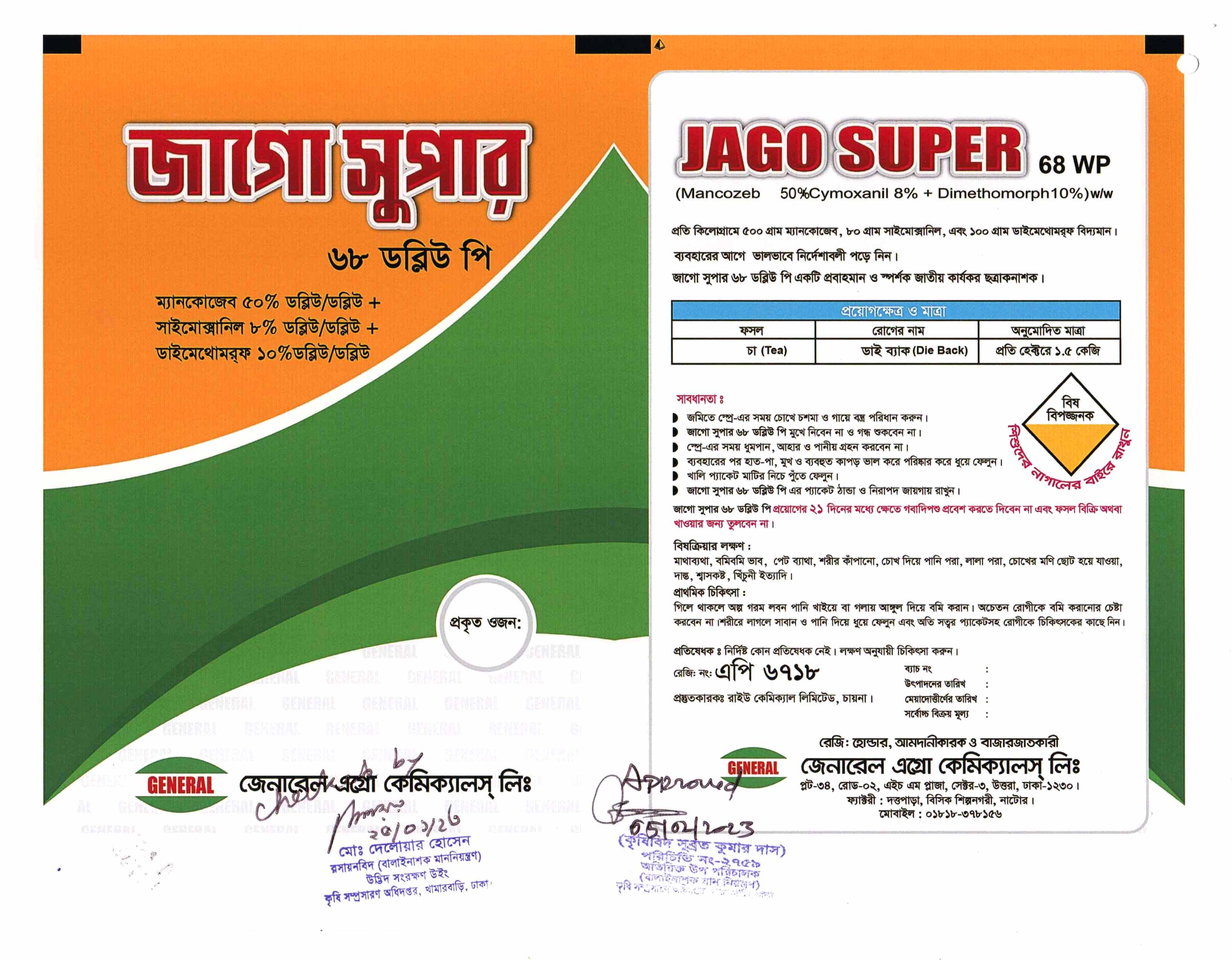 জাগো সুপার ৬৮ ডব্লিউ পি একটি প্রবাহমান ও স্পর্শক জাতীয় কার্যকর ছত্রাকনাশক। যা আলুর নাবী ধ্বসা (লেট ব্লাইট) এবং চা এর ডাই ব্যাক ছত্রাক দমনের জন্য বিশেষ উপযোগী।