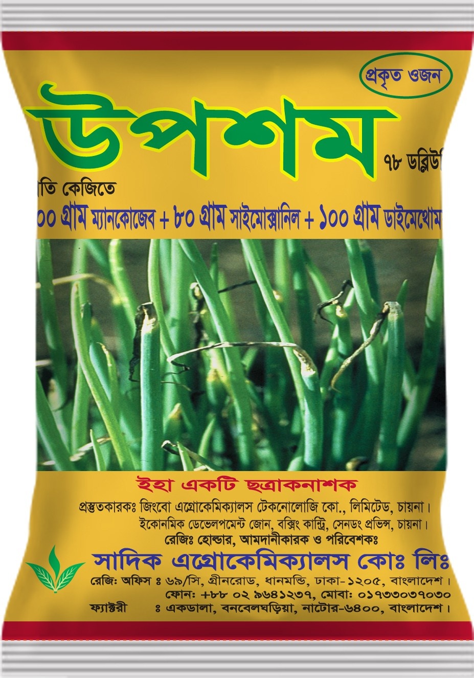 পেঁয়াজ এর পার্পল ব্লছ রোগের জন্য উপশম ৭৮ ডব্লিউপি ৪০০ গ্রাম/একর বা প্রতি ১০ লিটার পানিতে ২০ গ্রাম উপশম ভাল্ভাবে মিশিয়ে স্প্রে করতে হবে ।