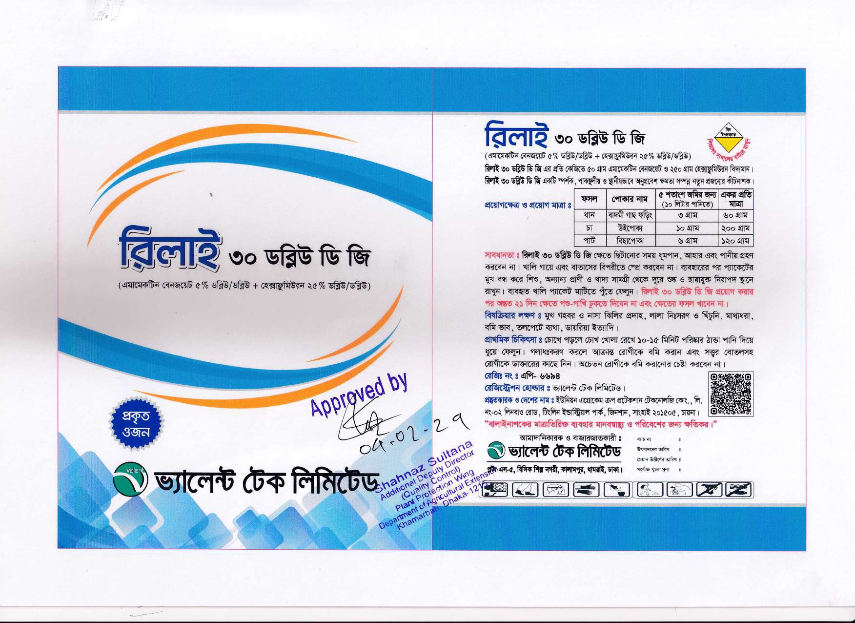 রিলাই ৩০ ডব্লিউ ডি জি স্পর্শক, পাকস্থলীয় ও স্থানীয়ভাবে অনুপ্রবেশ ক্ষমতা সম্পন্ন নতুন প্রজম্নের কীটনাশক। যা ধান- বাদামী গাছ ফড়িং, চা- উইপোকা, পাট- বিছাপোকা দমনে কার্যকারী