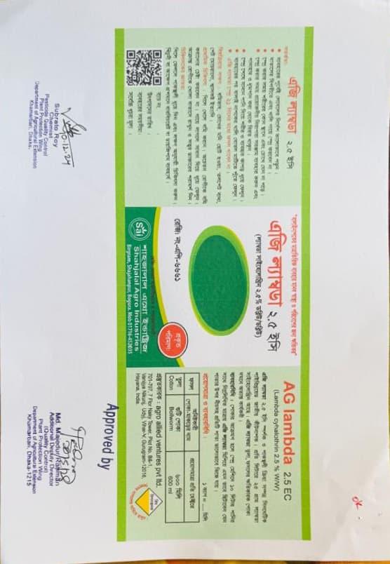 লেবেলে বর্ণিত ফসলের পোকা দমনে এজি ল্যাম্বডা কার্যকরী ও অনুমোদিত।