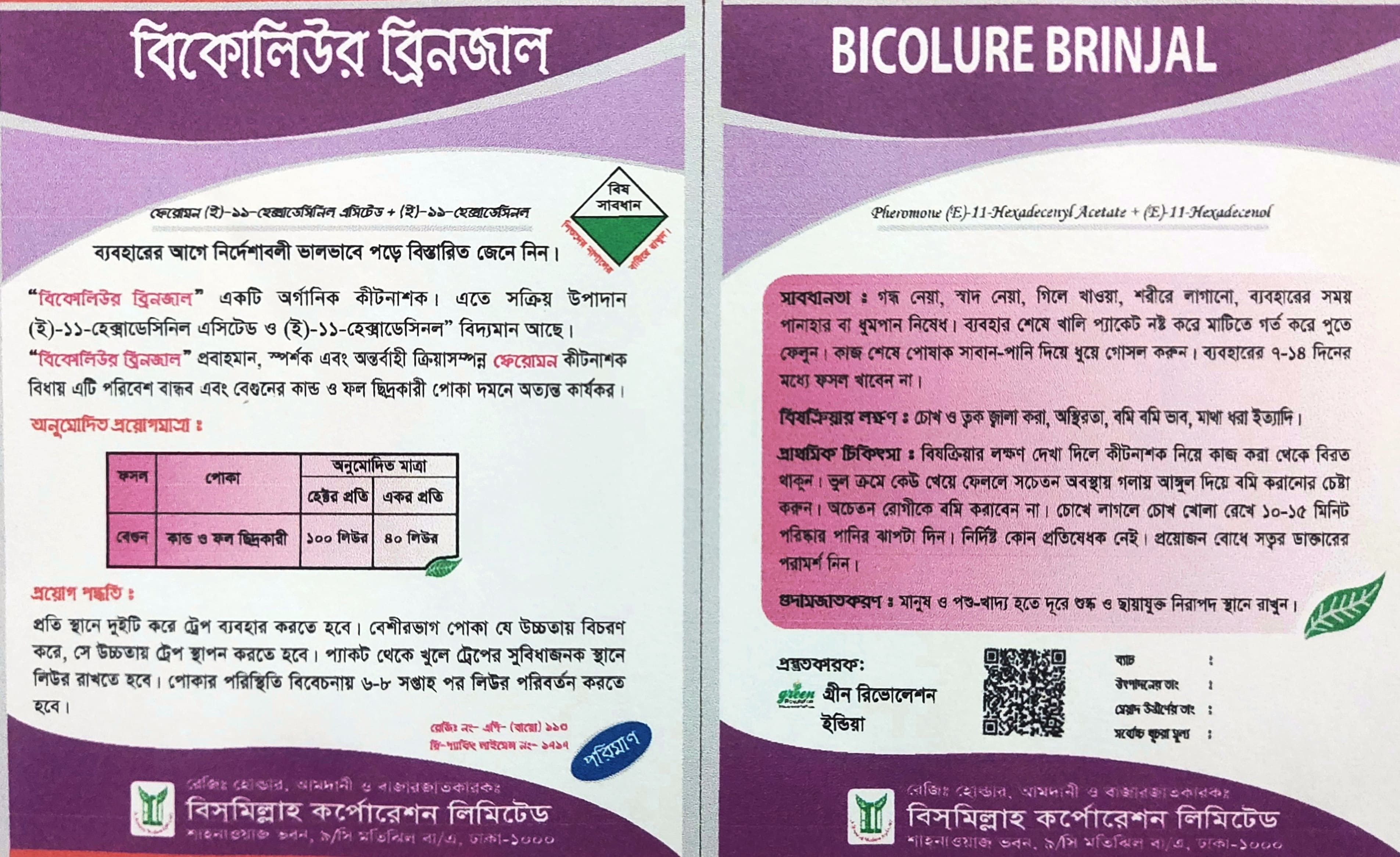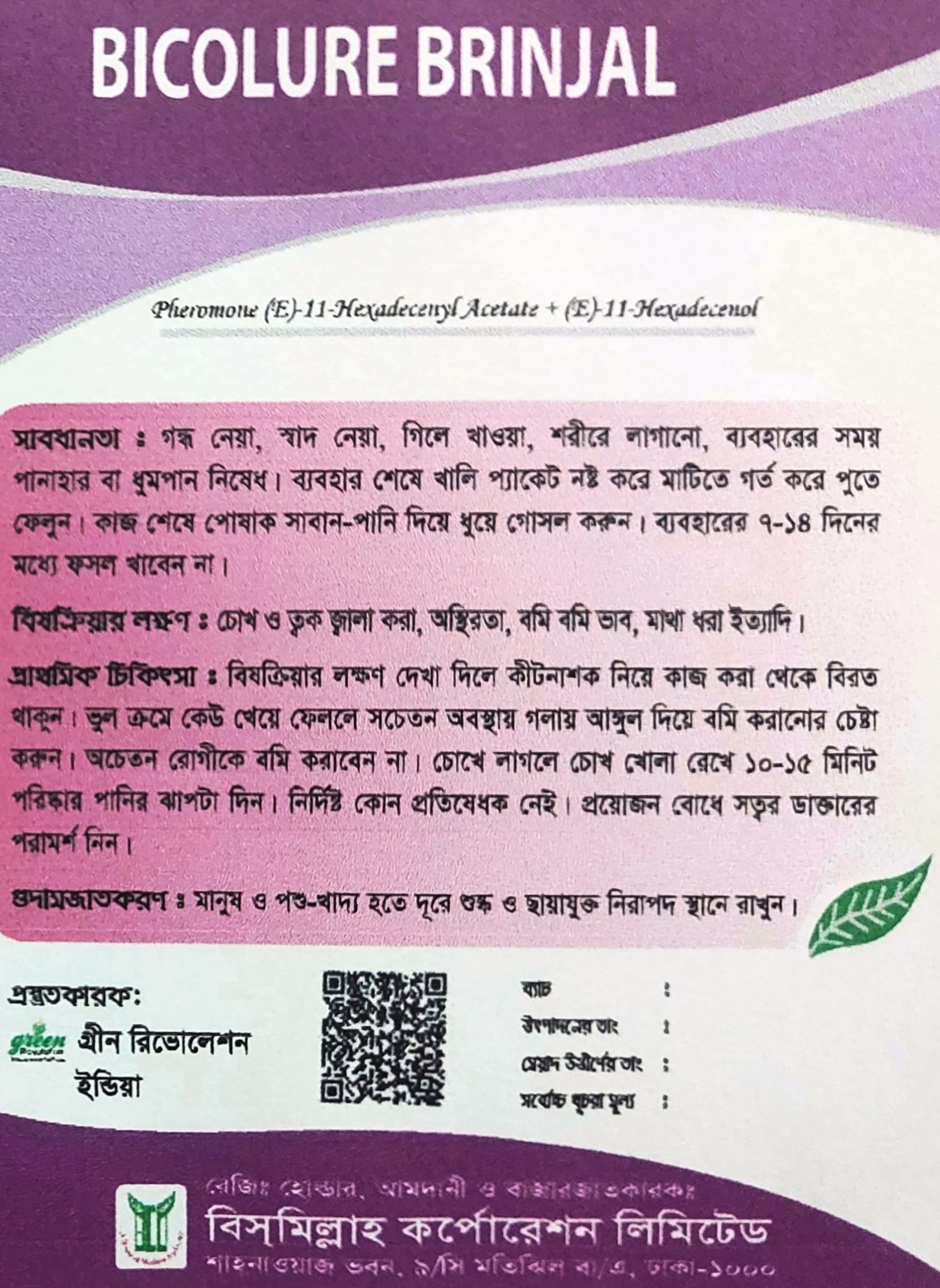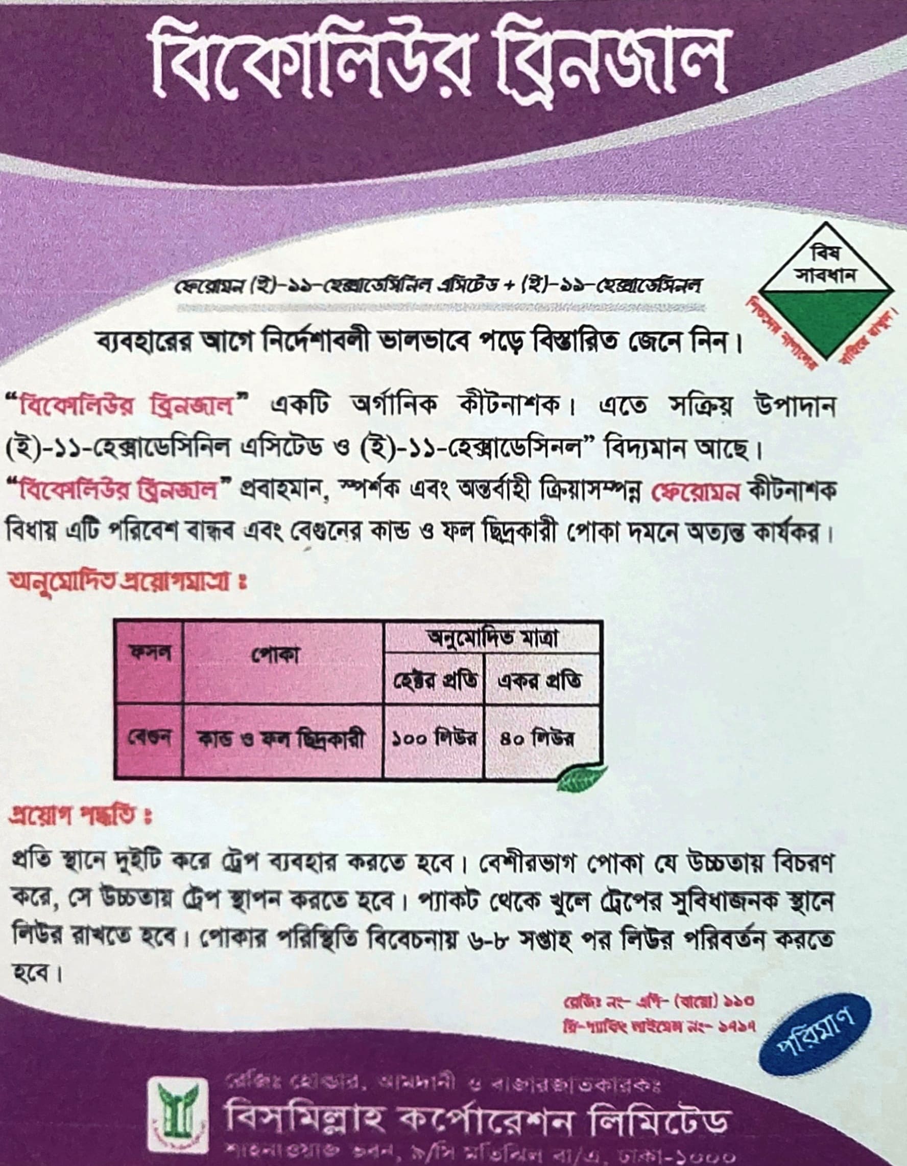 "বিকোলিউর ব্রিনজাল" একটি অর্গানিক কীটনাশক। এতে সক্রিয় উপাদান (ই)-১১-হেক্সাডেসিনিল এসিটেড ও (ই)-১১-হেক্সাডেসিনল" বিদ্যমান আছে। "বিকোলিউর ব্রিনজাল" প্রবাহমান, স্পর্শক এবং অন্তর্বাহী ক্রিয়াসম্পন্ন ফেরোমন কীটনাশক বিধায় এটি পরিবেশ বান্ধব এবং বেগুনের কান্ড ও ফল ছিদ্রকারী পোকা দমনে অত্যন্ত কার্যকর।