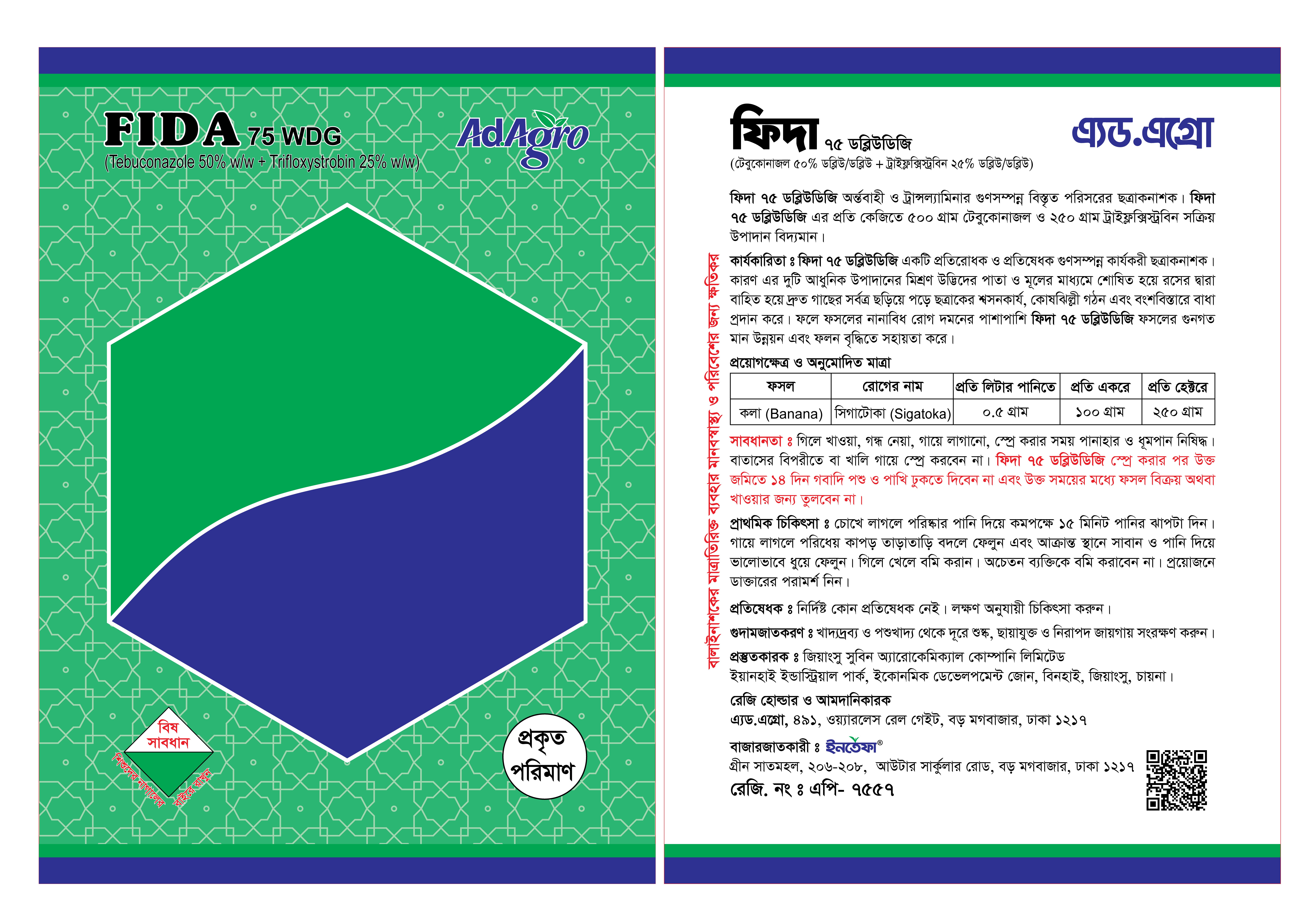 ফিদা ৭৫ ডব্লিউডিজি একটি প্রতিরোধক ও প্রতিষেধক গুণসম্পন্ন কার্যকরী ছত্রাকনাশক। কারণ এর দুটি আধুনিক উপাদানের মিশ্রণ উদ্ভিদের পাতা ও মূলের মাধ্যমে শোষিত হয়ে রসের দ্বারা বাহিত হয়ে দ্রুত গাছের সর্বত্র ছড়িয়ে পড়ে ছত্রাকের শ্বসনকার্য, কোষঝিল্লী গঠন এবং বংশবিস্তারে বাধা প্রদান করে। ফলে ফসলের নানাবিধ রোগ দমনের পাশাপাশি ফিদা ৭৫ ডব্লিউডিজি ফসলের গুনগত মান উন্নয়ন এবং ফলন বৃদ্ধিতে সহায়তা করে।