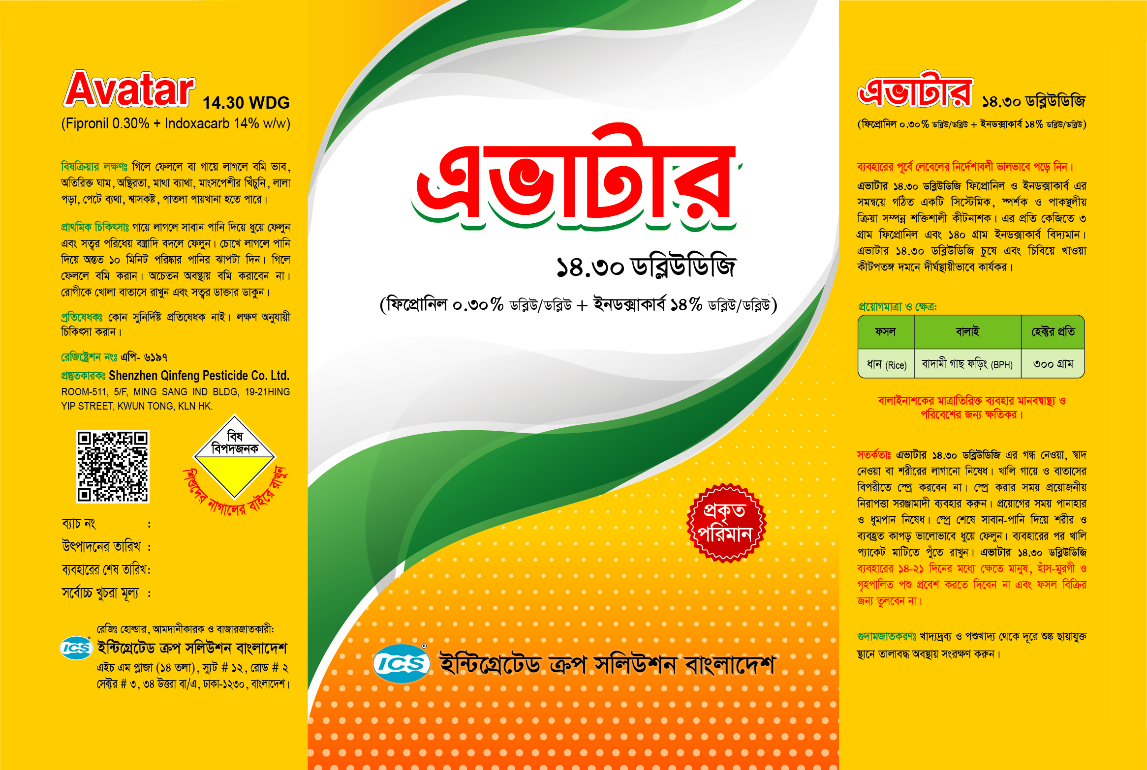 Avater 14.30 WDG ধানের বাদামী গাছ ফড়িং দমনে হেক্টর প্রতি 300 গ্রাম পানিতে মিশিয়ে স্প্রে করতে হবে।