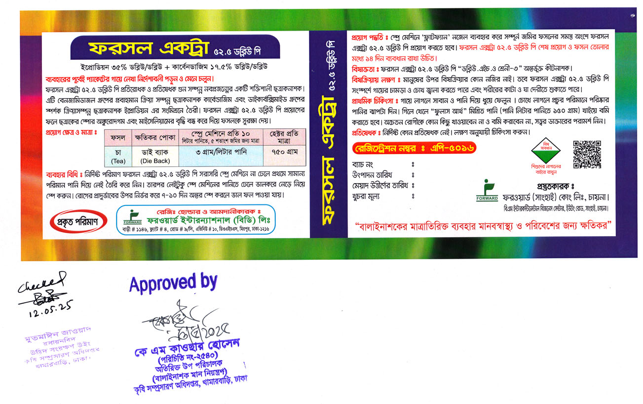 ফরসল এক্সট্রা ৫২.৫ ডব্লিউপি প্রতিরোধক ও প্রতিষেধক গুণসম্পন্ন নব প্রজন্মের একটি শক্তিশালী ছত্রাকনাশক। এটি বেনজামিডাজল গ্রুপের প্রবাহমান ক্রিয়া সম্পন্ন ছত্রাকনাশক কার্বেন্ডাজিম এবং ডাইকার্বক্সিমাইড গ্রুপের স্পর্শক ক্রিয়াসম্পন্ন ছত্রাকনাশক ইপ্রোডিয়ন এর সংমিশ্রনে তৈরি। ফরসল এক্সট্রা ৫২.৫ ডব্লিউপি প্রয়োগের ফলে ছত্রাকের স্পোর অঙ্কুরোদগম এবং মাইসেলিয়ামের বৃদ্ধি বন্ধ করে দিয়ে ফসলকে সুরক্ষা দেয়। এটি চায়ের ডাই ব্যাক (Die Back) প্রতিরোধে অত্যন্ত কার্যকরী।