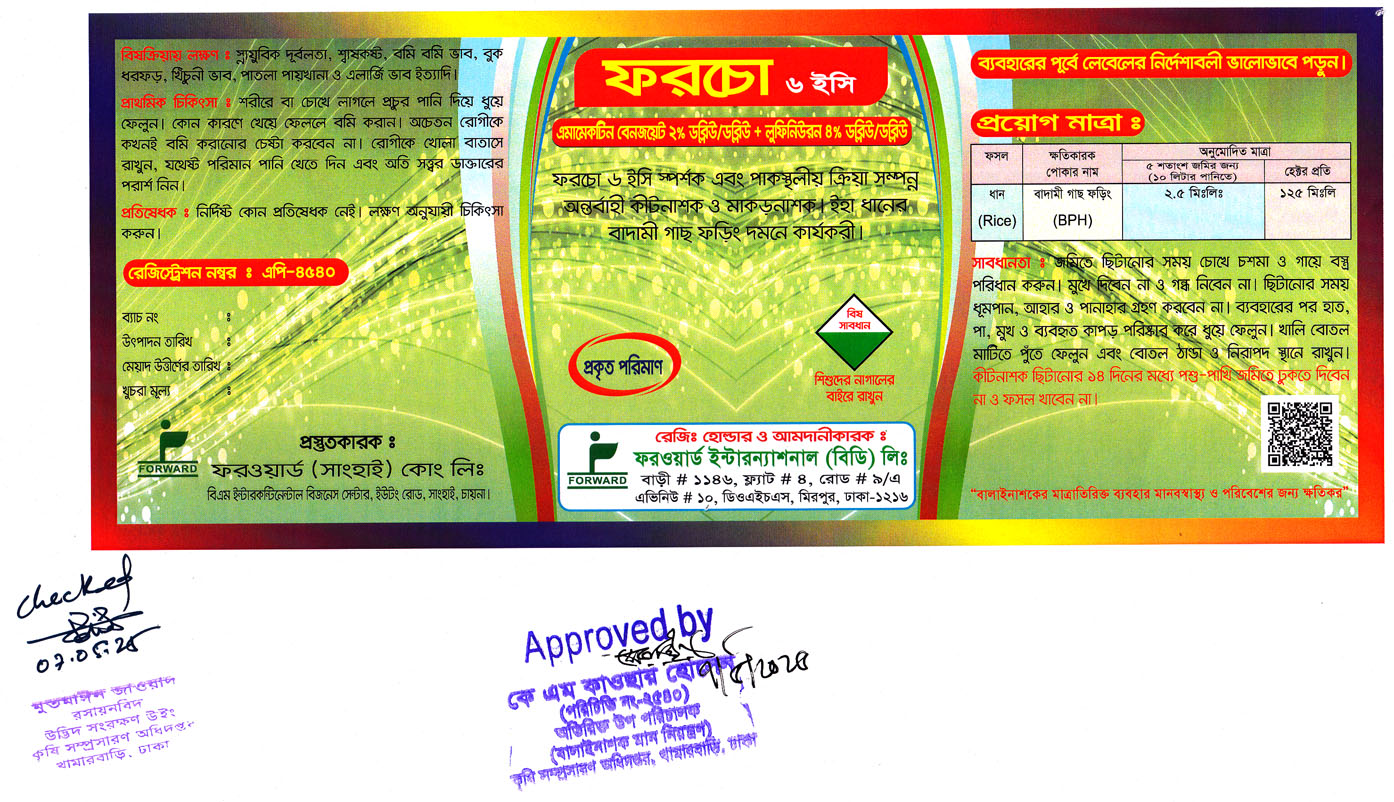 ফরচো ৬ ইসি স্পর্শক এবং পাকস্থলীয় ক্রিয়া সম্পন্ন অন্তর্বাহী কীটনাশক ও মাকড়নাশক। ইহা ধানের বাদামী গাছ ফড়িং (BPH) দমনে কার্যকরী।