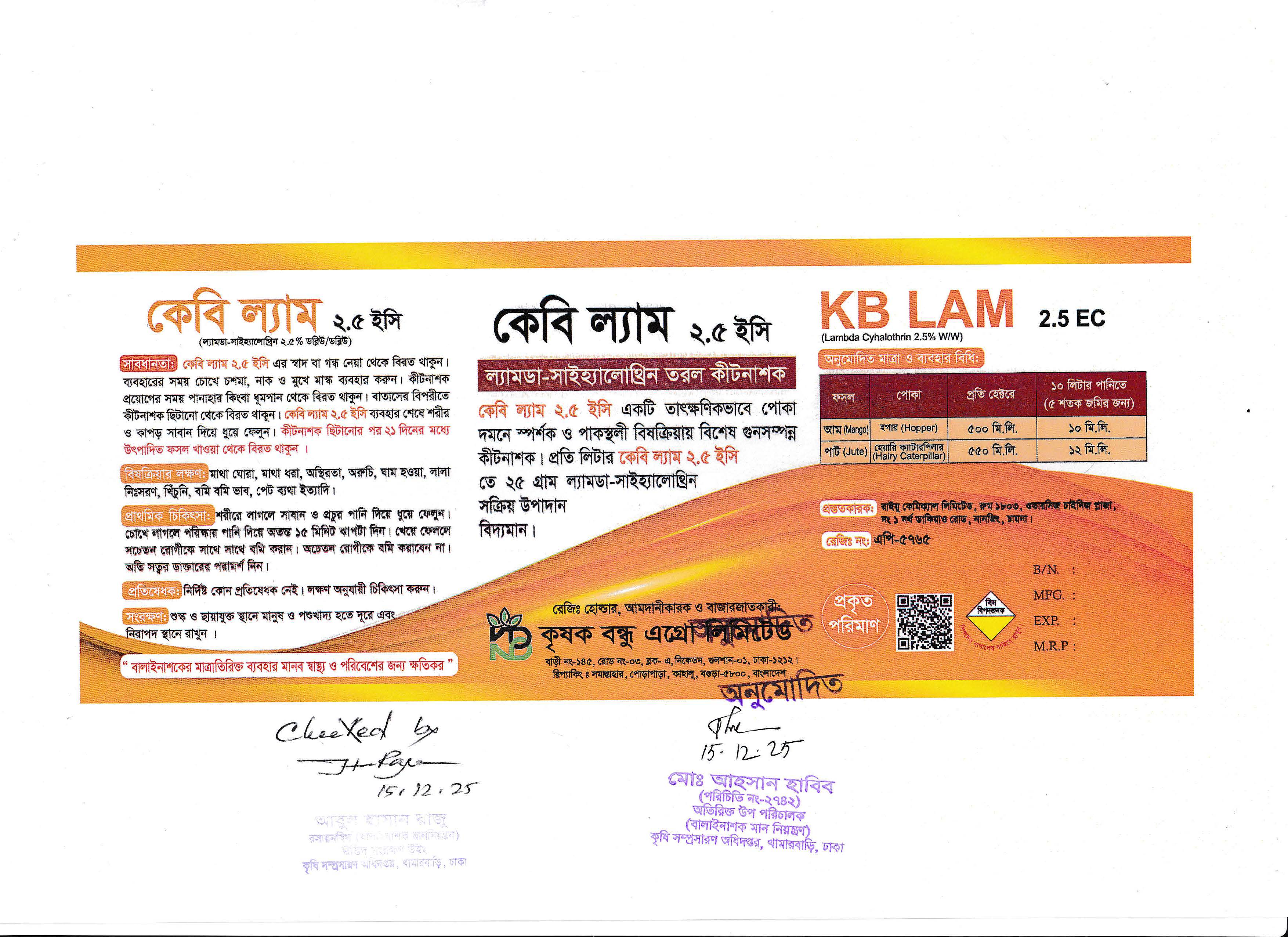 কেবি ল্যাম ২.৫ ইসি একটি তাৎক্ষণিকভাবে পোকা দমনে স্পর্শক ও পাকস্থলী বিষক্রিয়ায় বিশেষ গুনসম্পন্ন কীটনাশক। প্রতি লিটার কেবি ল্যাম ২.৫ ইসি তে ২৫ গ্রাম ল্যামডা-সাইহ্যালোথ্রিন সক্রিয় উপাদান বিদ্যমান।