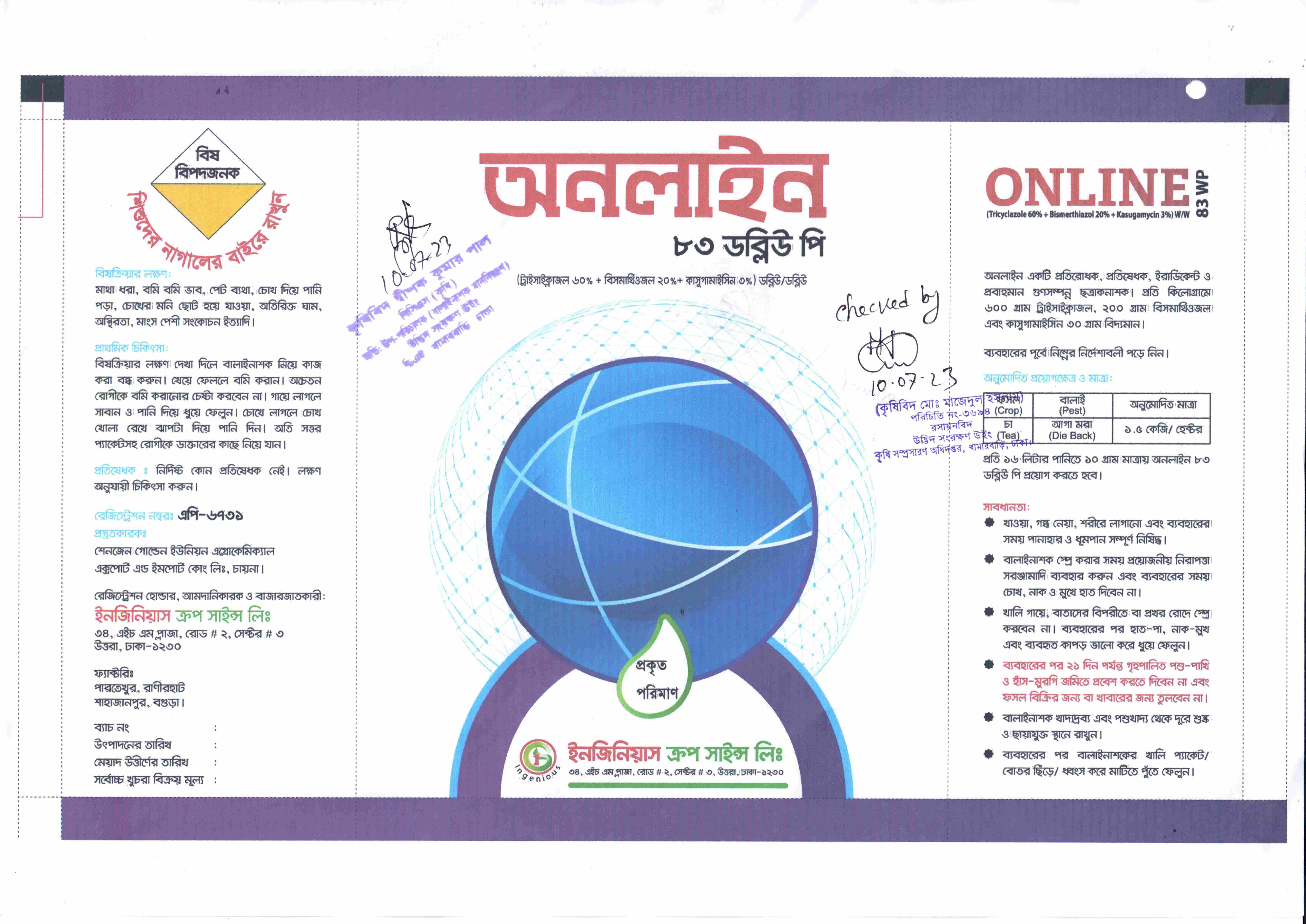 অনলাইন একটি সর্বাধুনিক তিন উপাদান সম্বলিত প্রতিরোধক, প্রতিষেধক, ইরাডিকেন্ট এবং প্রবাহমান গুনসম্পন্ন ব্যাকটেরিয়া ও ছত্রাকনাশক যা ধানের ব্যাকটেরিয়াল লিফ ব্লাইট (বিএলবি) এবং সকল ধরনের ব্লাস্ট (লিফ ব্লাস্ট, নেক ব্লাস্ট, পেনিক্যাল ব্লাস্ট ইত্যাদি) রোগের প্রতিরোধক এবং প্রতিষেধক উভয় হিসেবে কাজ করে। সবজির সকল প্রকার ব্যাকটেরিয়া ও ছত্রাক জনিত রোগ নিয়ন্ত্রণে কাজ করে।