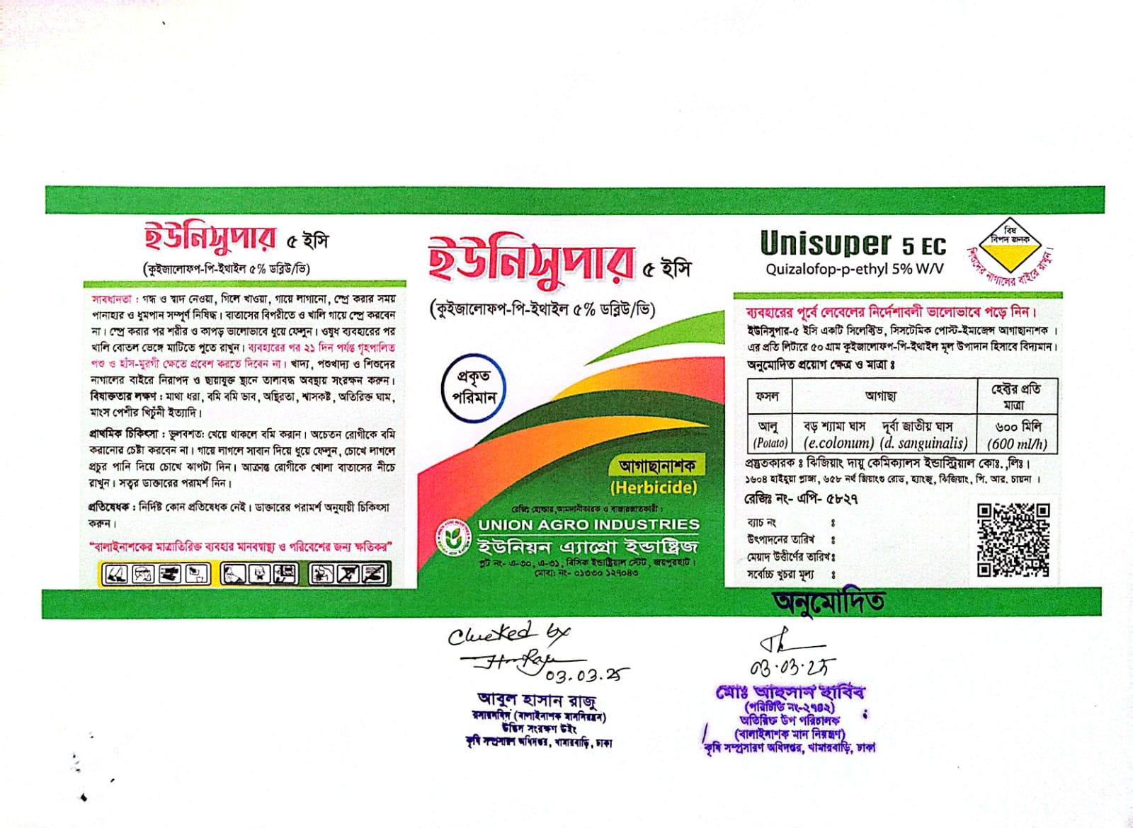 ইউনিসুপার-৫ ইসি একটি সিলেক্টিভ, সিসটেমেটিক পোস্ট-ইমাজেন্স আগাছানাশক। এর প্রতি লিটারে ৫০ গ্রাম কুইজালোফপ-পি-ইথাইল মূল উপাদান হিসেবে বিদয়মান।