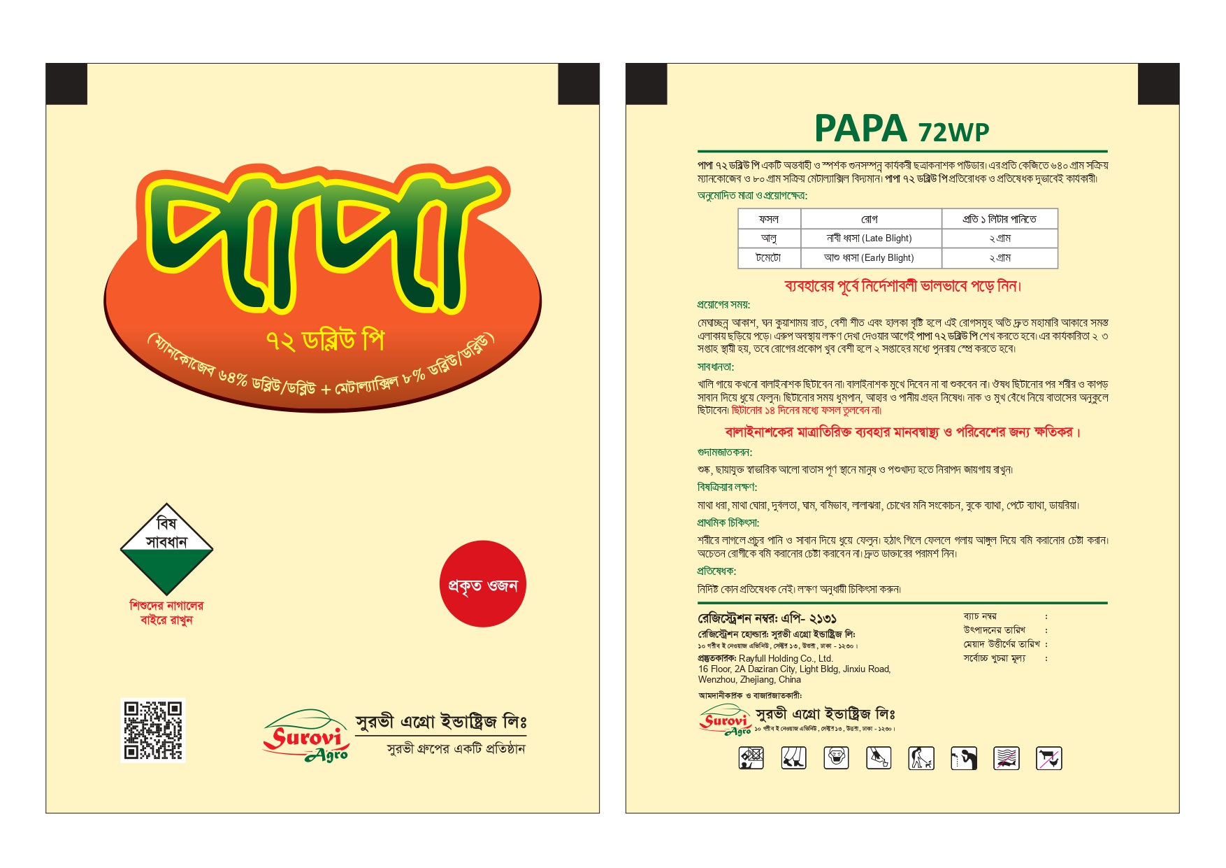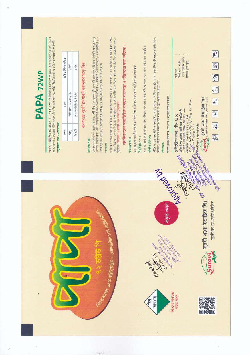 পাপা ৭২ ডব্লিউ পি একটি অন্তর্বাহী ও স্পর্শক গুনসম্পন্ন কার্যকারী ছত্রাকনাশক পাউডার।