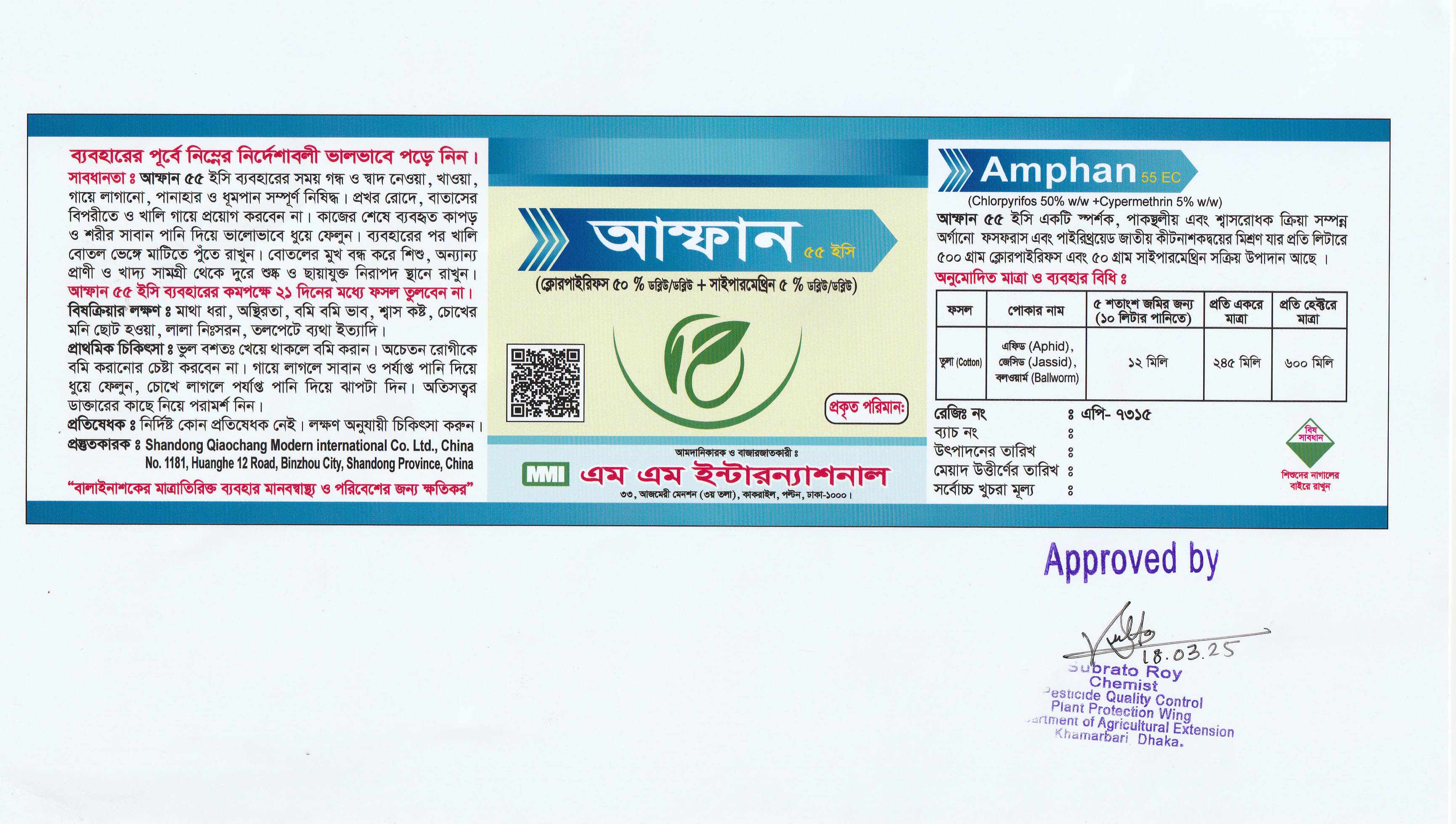 Amphan 505 EC (Chlorpyrifos 50% + Cypermethrin 5%) can be used in crop field of cotton, brinjal and potato etc.