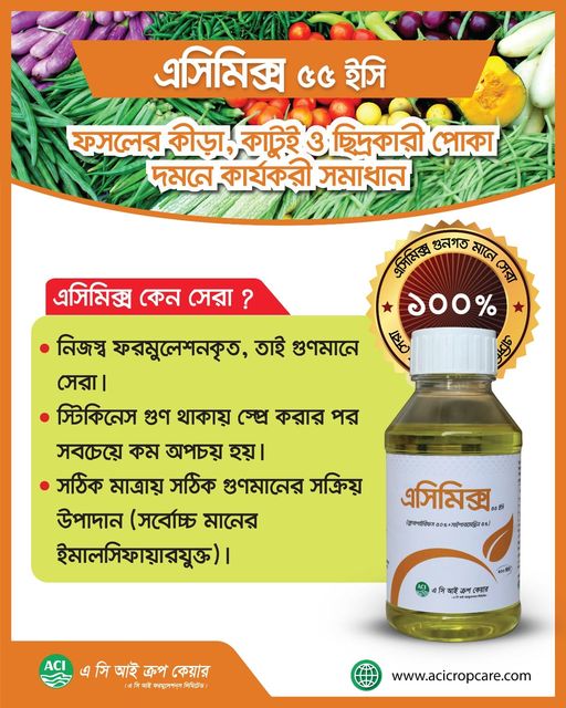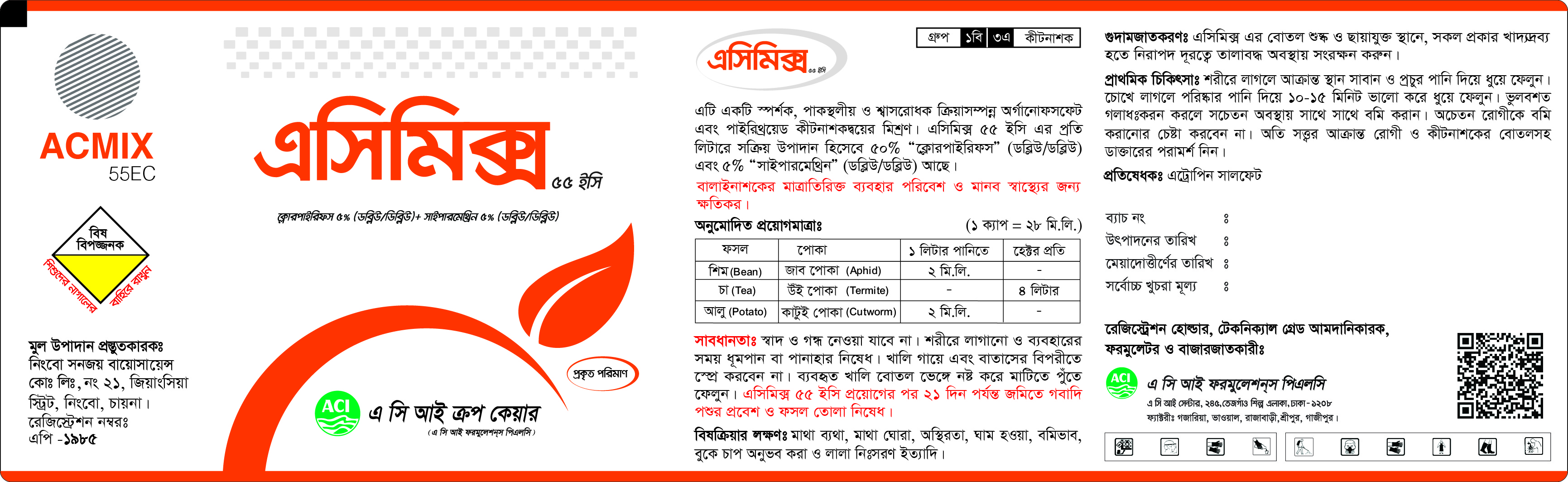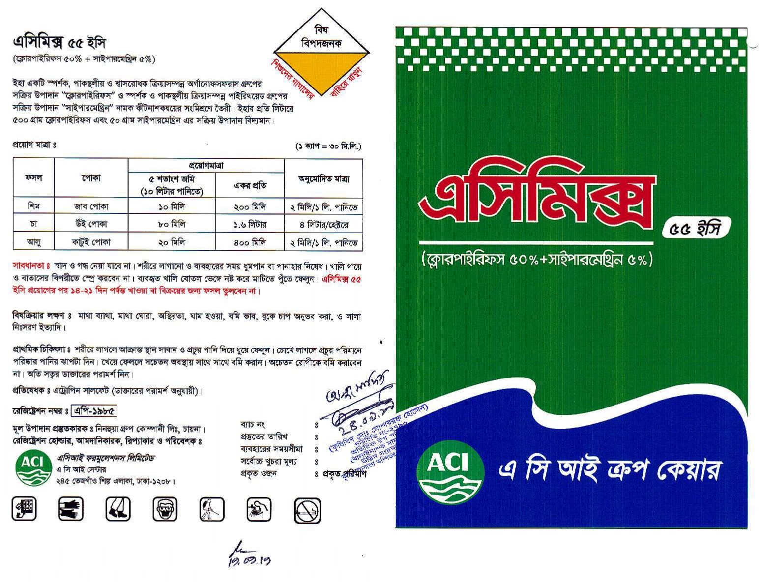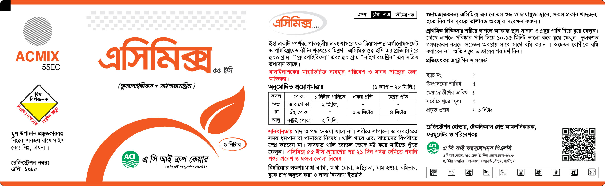এসিমিক্স ৫৫ ইসি একটি স্পর্শক, পাকস্থলীয় এবং শ্বাসরোধক ক্রিয়াসম্পন্ন অর্গানোফসফেট ও পাইরিথ্রয়েড কীটনাশকদ্বয়ের মিশ্রণ। এটি ফসলের কীড়া, কাটুই ও ছিদ্রকারী পোকা দমনে কার্যকর।