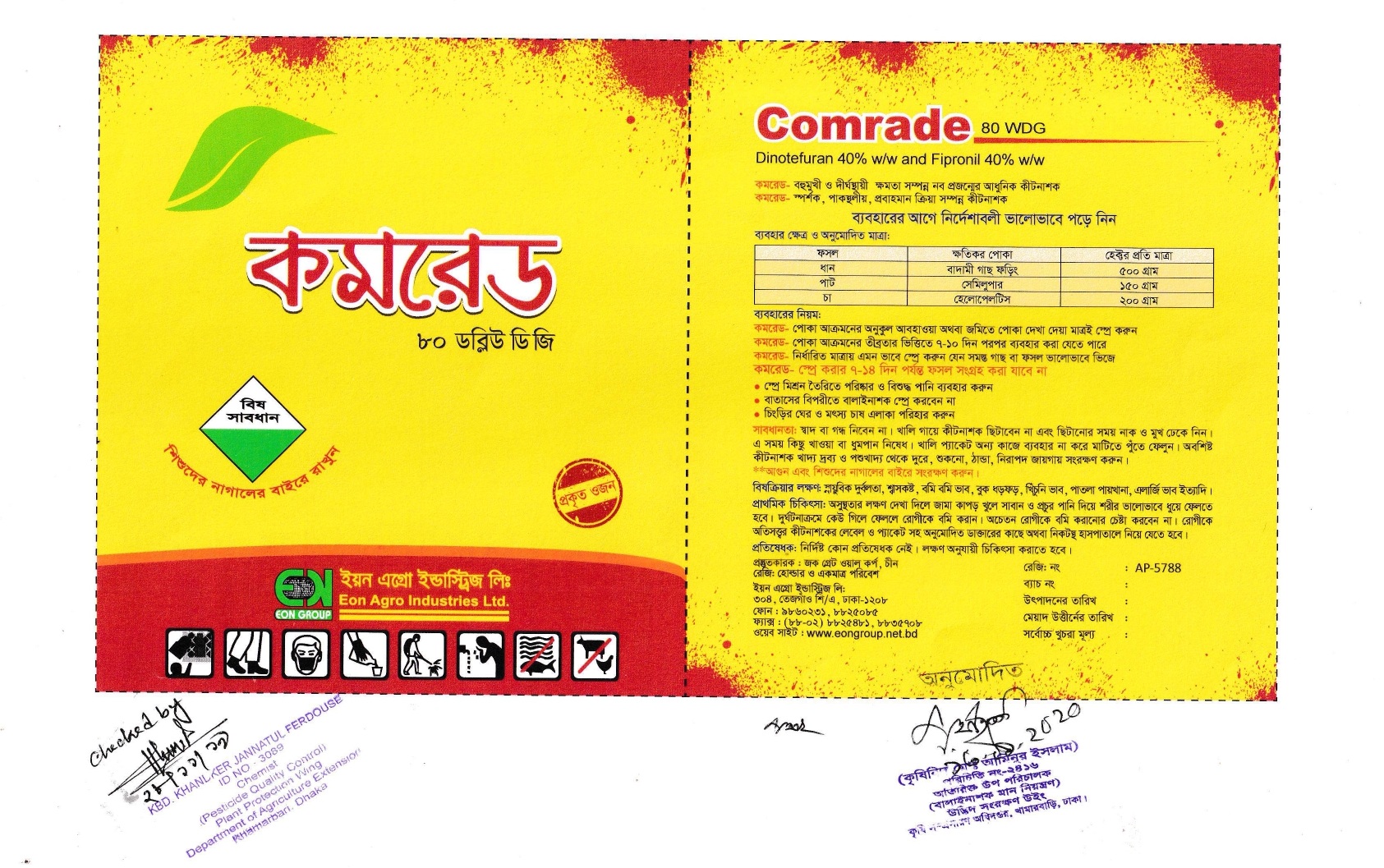 ব্যবহার মাত্রা: প্রতি হেক্টরে ৫০০ গ্রাম। পোকা আক্রমনের অনুকুল আবহাওয়া অথবা জমিতে পোকা দেখা দেয়া মাত্রই স্প্রে করুন। পোকা আক্রমনের তীব্রতার ভিত্তিতে ৭-১০ দিন পরপর ব্যবহার করা যেতে পারে । নির্ধারিত মাত্রায় এমন ভাবে স্প্রে করুন যেন সমস্ত গাছ বা ফসল ভালোভাবে ভিজে ।কমরেড স্প্রে করার ১৪ দিন পর ফসল সংগ্রহ করুন। ● স্প্রে মিশ্রন তৈরিতে পরিষ্কার ও বিশুদ্ধ পানি ব্যবহার করুন। ● বাতাসের বিপরীতে বালাইনাশক স্প্রে করবেন না। ● চিংড়ির ঘের ও মৎস্য চাষ এলাকা কমরেড ব্যবহার পরিহার করুন।