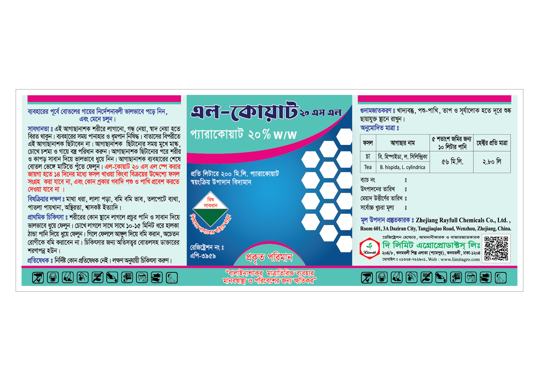 এল-কোয়াট ২০ এস এল এর প্রতি লিটারে ২০০ মি: লি: প্যারাকোয়াট স্বয়ংক্রিয় উপাদান বিদ্যমান। ইহা চা গাছের আগাছা বি.হিস্পাইডা এবং ল.সিলিন্দ্রিকা দমনে অধিক কার্যকরী।
