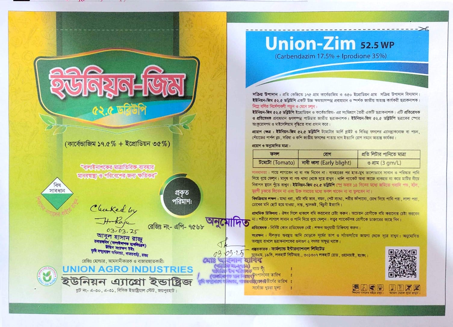প্রতি কেজিতে ১৭৫ গ্রাম কার্বেন্ডাজিম ও ৩৫০ গ্রাম ইপ্রোডিয়ন সক্রিয় উপাদান বিদ্যমান। ইউনিয়ন-জিম ৫২.৫ ডব্লিউপি একটি উচ্চ ক্ষমতাসম্পন্ন প্রবাহমান ও স্পর্শক জাতীয় অত্যন্ত কার্যকরী ছত্রাকনাশক।