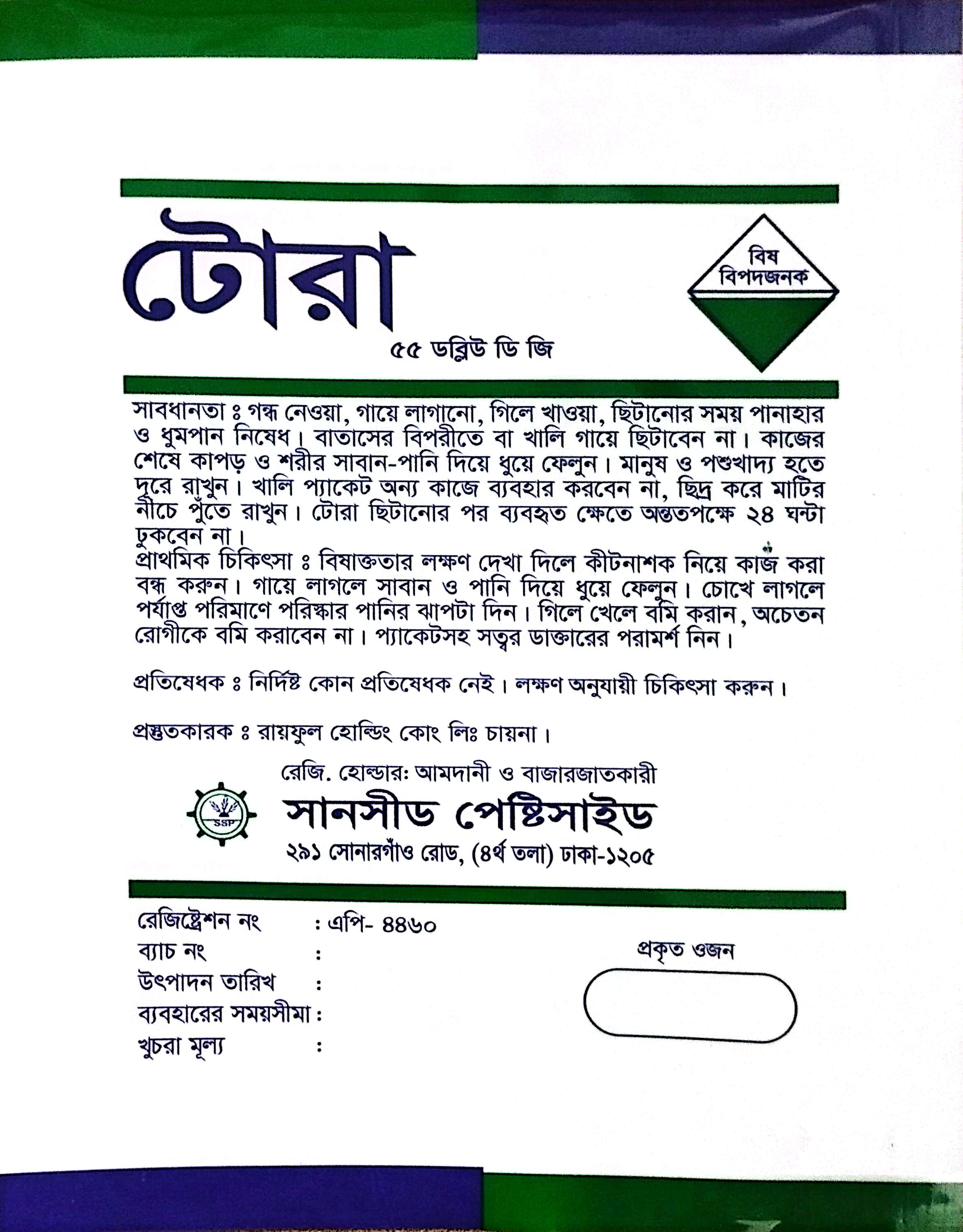 টোরা-৫৫ ডব্লিউ জি ফসলের জমিতে স্প্রে করার পর ১৭-২১ দিন ফসল খাবেন না বা ব্যাবহার করনে না।