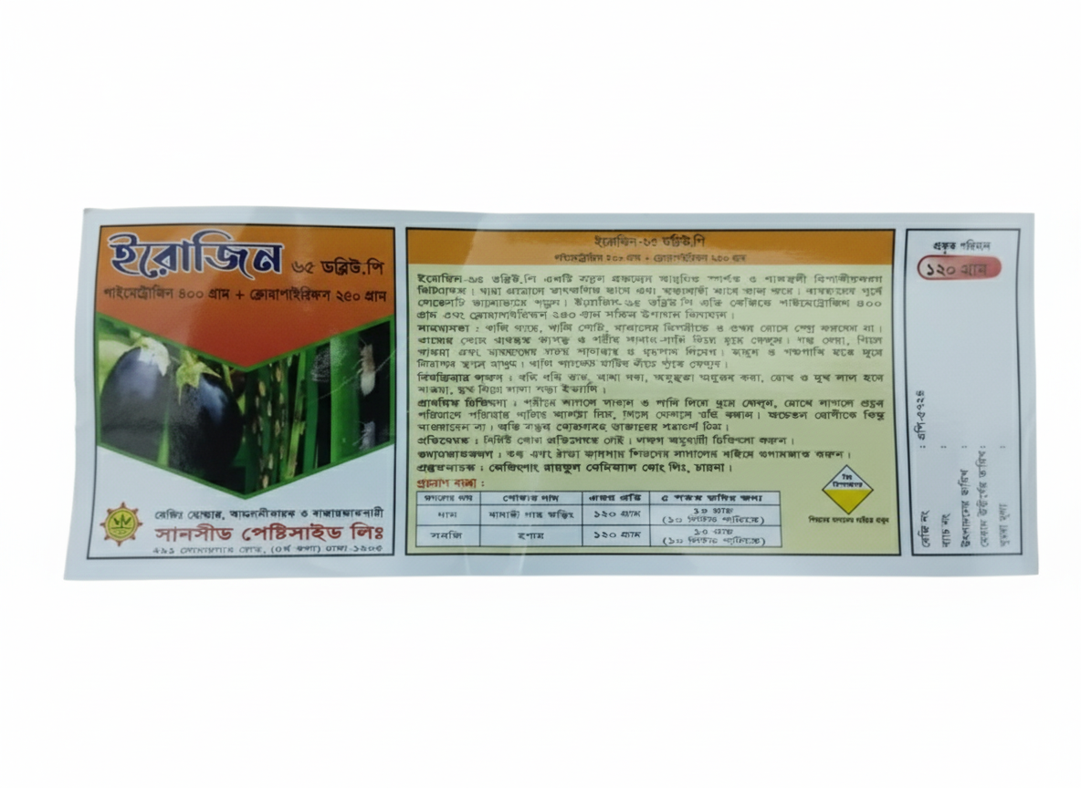 ০৫ শতক জমির জন্য ১০ লিটার পানিতে (ইরোজিন-৬৫ ডব্লিউ পি ) ১৫ গ্রাম ভাল ভাবে মিশিয়ে স্প্রে করতে হবে।