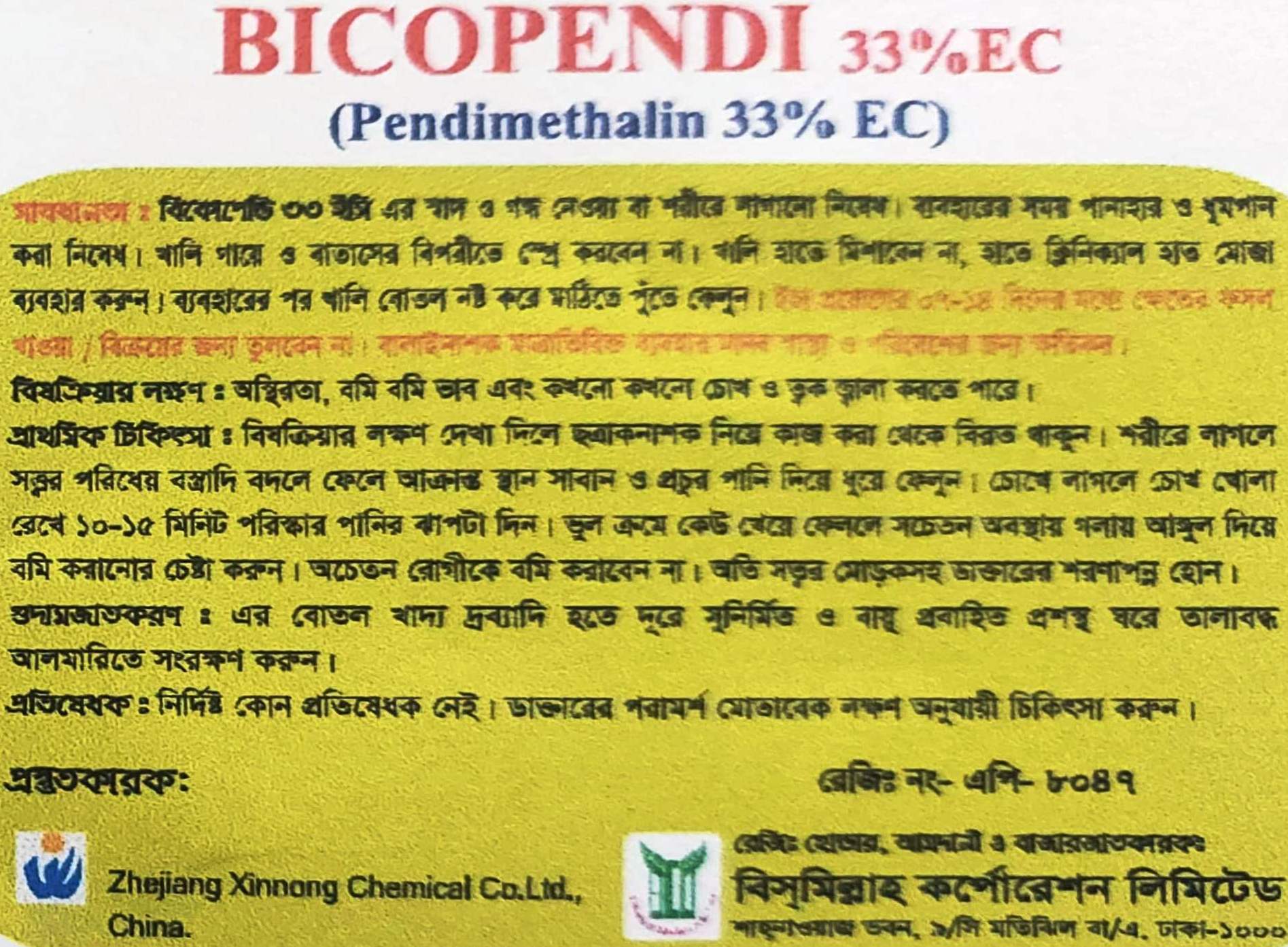 বিকোপেন্ডি ৩৩ ইসি একটি নতুন প্রজন্মের স্পর্শক ও সিলেক্টিভ আগাছানাশক। ইহা জিন প্রযুক্তির মাধ্যমে প্রস্তুতকৃত আগাছানাশক যা ধান ও আলু ক্ষেতের বিস্তৃত পরিসরে আগাছা দমন, বংশ বিস্তার ও বৃদ্ধিতে বাধা প্রদানে বিশেষভাবে কার্যকর। বিকোপেন্ডি ৩৩ ইসি এর প্রতি লিটারে ৩৩০ গ্রাম পেন্ডিমিথালিন সক্রিয় উপাদান বিদ্যমান।