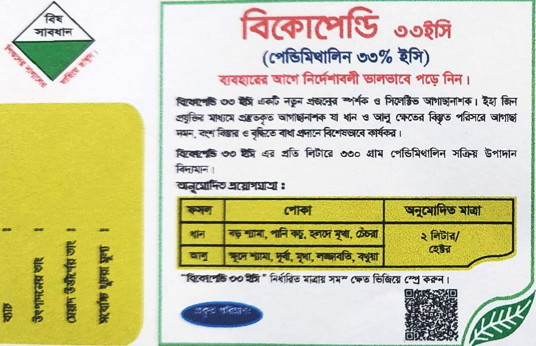ফসল – ধান; আগাছার নাম - বড় শ্যামা, পানি কচু, হলদে মুথা, চেচড়া; অনুমোদিত প্রয়োগ মাত্রাঃ হেক্টর প্রতি ২ লিটার। ফসল – আলু, আগাছার নাম - খুদে শ্যামা, দুর্বা, মুথা, লজ্জাবতী, বথুয়া; অনুমোদিত প্রয়োগ মাত্রাঃ হেক্টর প্রতি ২ লিটার। বিকোপেন্ডি ৩৩ ইসি নির্ধারিত মাত্রায় সমস্ত ক্ষেত ভিজিয়ে স্প্রে করুন।