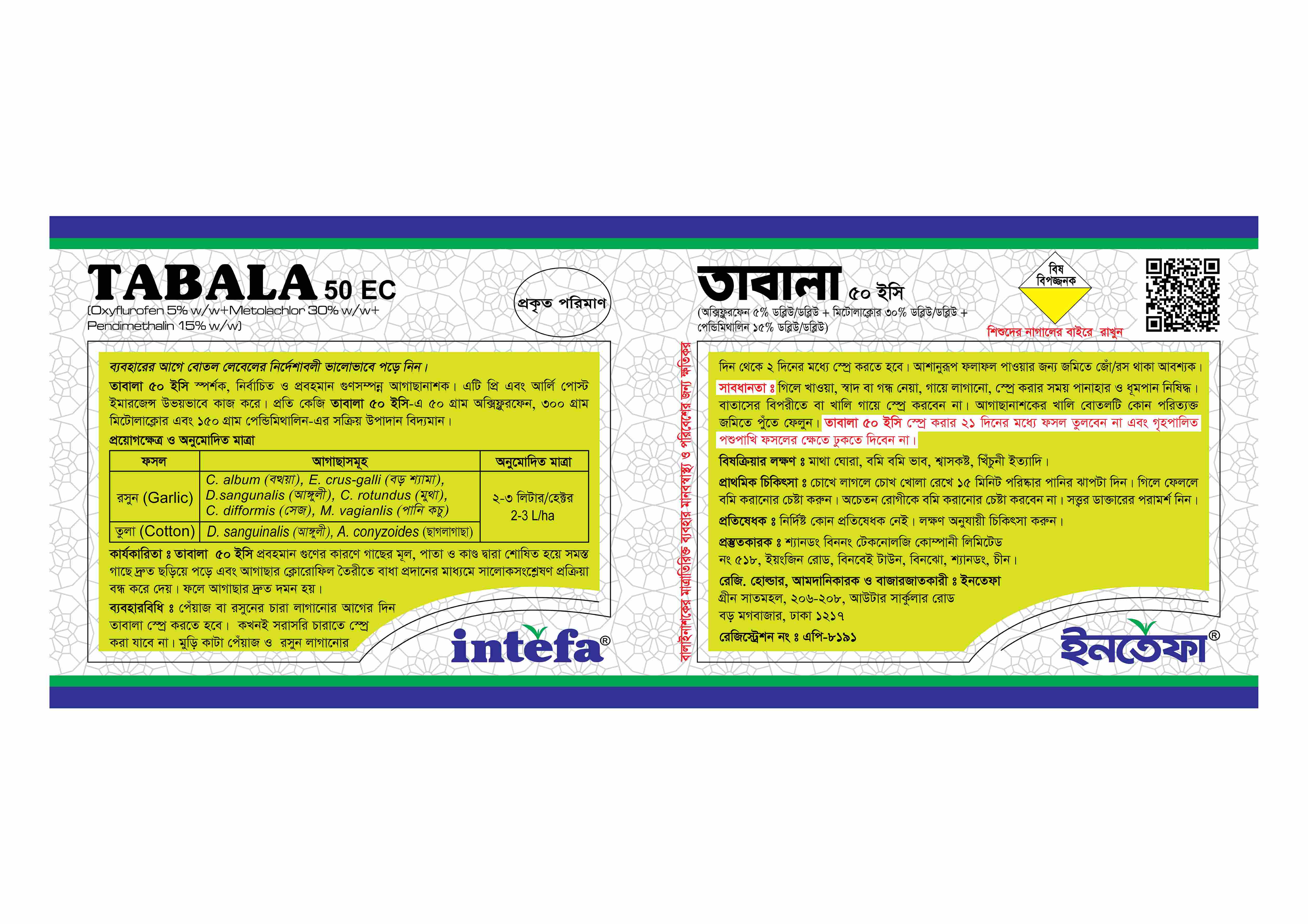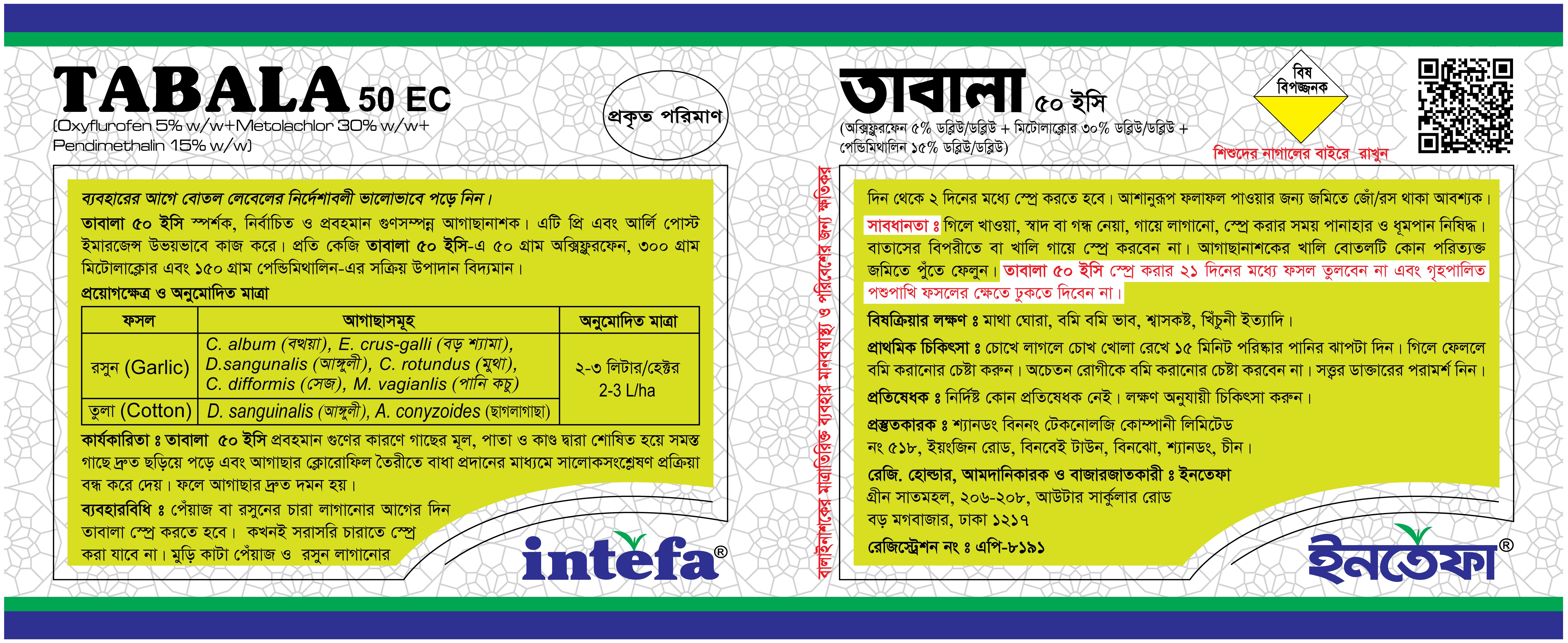 তাবালা ৫০ ইসি স্পর্শক, নির্বাচিত ও প্রবহমান গুণসম্পন্ন আগাছানাশক। এটি যি এবং আর্লি পোস্ট ইমারজেন্স উভয়ভাবে কাজ করে।