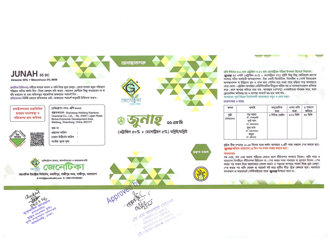 লেবেলে বর্ণিত ফসলের বালাই দমনে জুনাহ ৫৫ এস সি কার্যকরী ও অনুমোদিত।