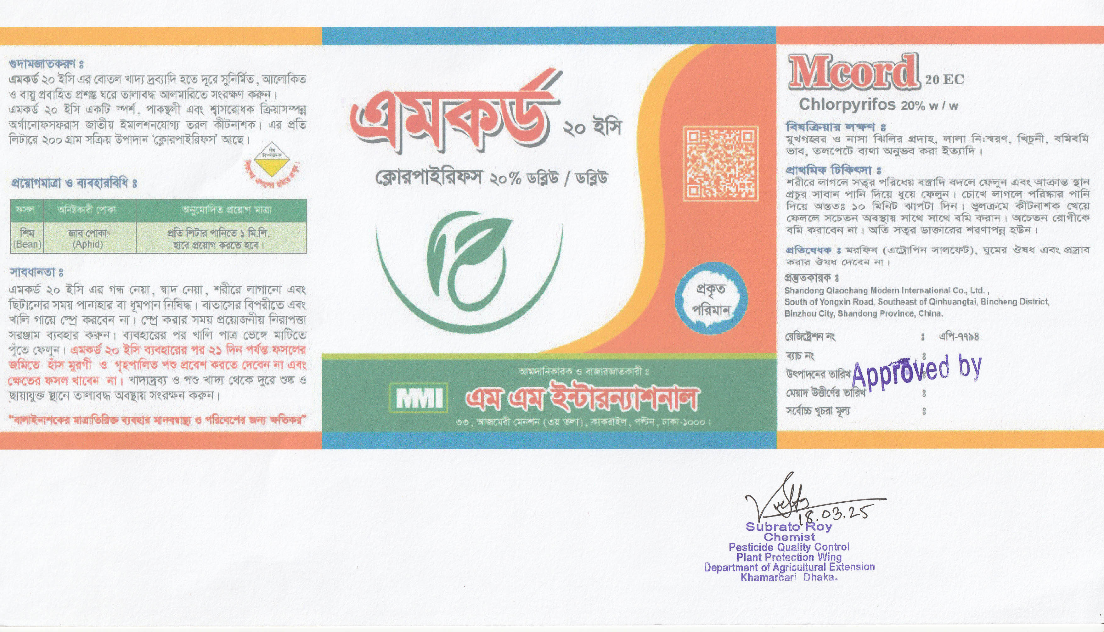 Mcord 20 EC (Chlorpyrifos 20%) containing 20% Chlorpyrifos, is an effective broad-spectrum insecticide for controlling chewing, sucking, and soil-dwelling pests on various crops like cotton, vegetables, and fruits. It provides quick knock-down and residual control through contact, stomach, and fumigant action. it acts on the nervous system of pests and can control rice gall midge. Therefore, while effective for pest control, its use requires caution due to significant environmental and health concerns.