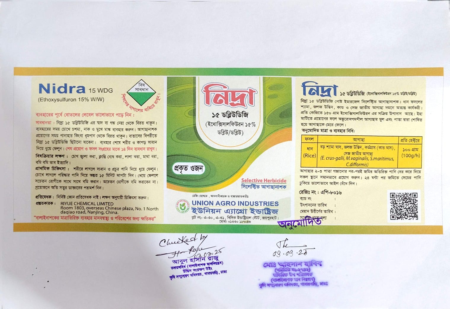 নিদ্রা ১৫ ডব্লিউডিজি পোষ্ট ইমারজেন্স সিলেক্টিভ আগাছানাশক। ধান ফসলের শ্যামা, জলজ উদ্ভিদ, কান্ড ও সেজ জাতীয় আগাছা দমনে অত্যন্ত কার্যকরী। প্রতি কেজিতে ১৫০ গ্রাম ইথোক্সিসালফিউরন এর সক্রিয় উপাদান আছে। ইহা মাটিতে প্রয়োগের ফলে অঙ্কুরোদগমশীল আগাছার মুল এবং পাতা দ্বারা শোষিত হয়ে আগাছাকে মেরে ফেলে।
