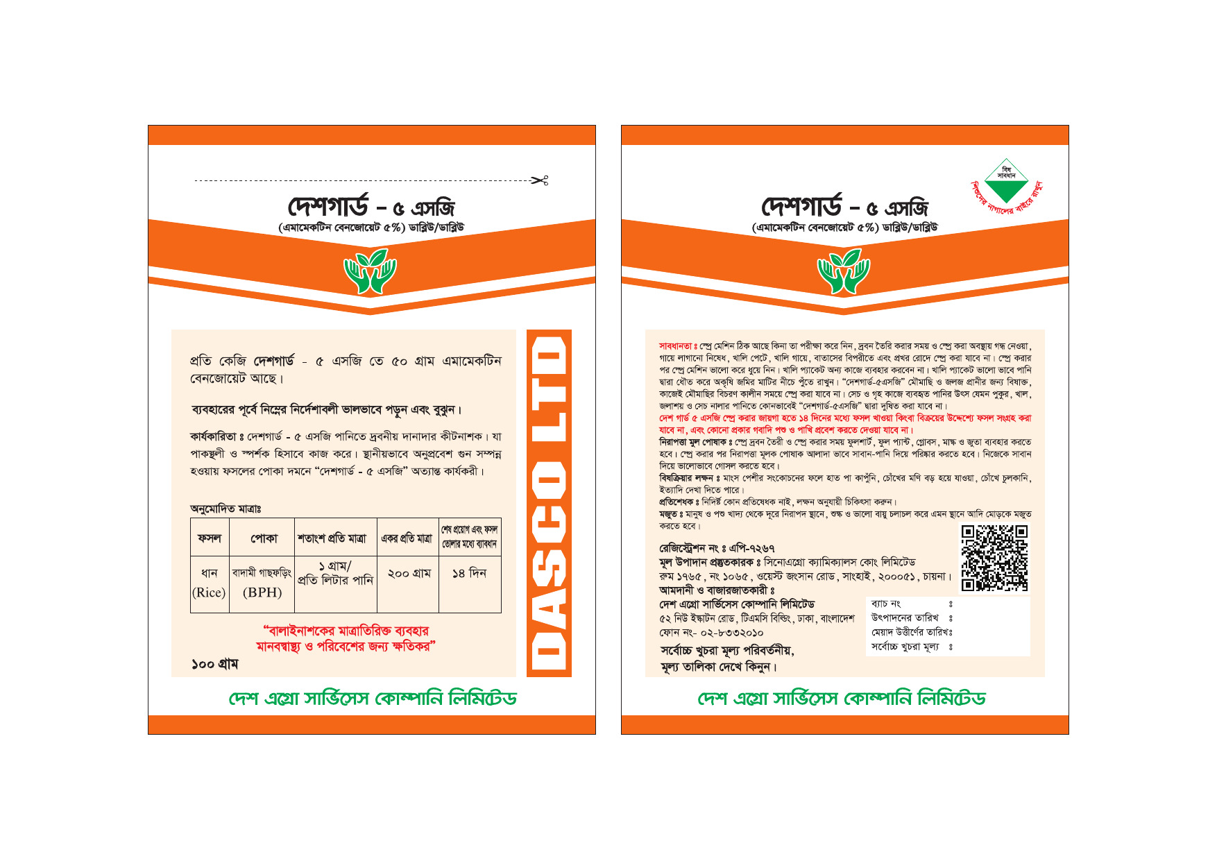 দেশগার্ড ৫ এসজি পানিতে দ্রবণীয় দানাদার কীটনাশক। যা পাকস্থলী ও স্পর্শক হিসেবে কাজ করে। স্থানীয়ভাবে অনুপ্রবেশ গুন সম্পন্ন হওয়ায় ফসলের পোকা দমনে দেশগার্ড ৫ এসজি অত্যন্ত কার্যকরী।