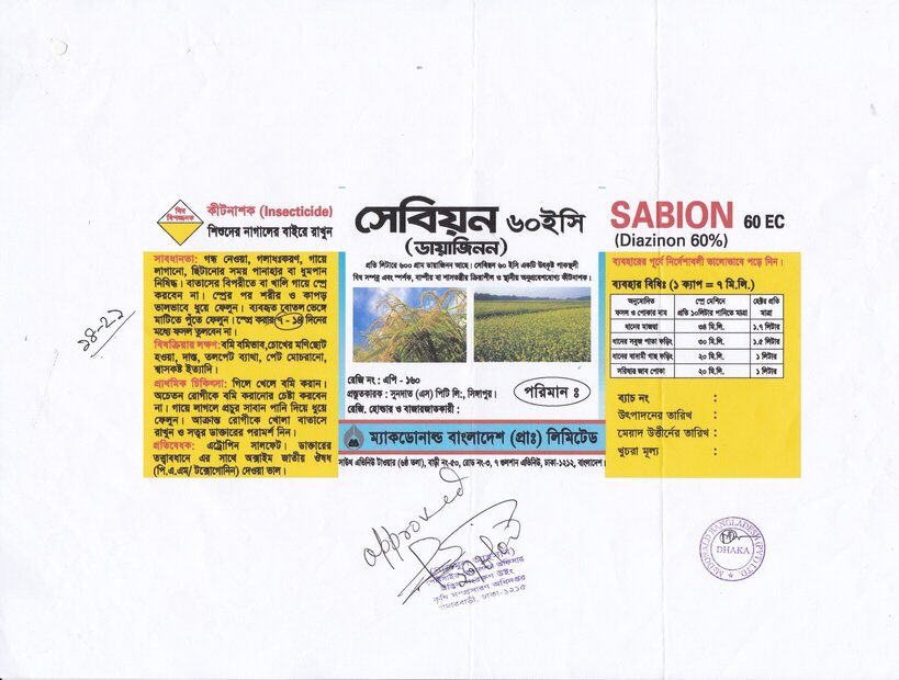 Contains 600 grams of diazinon per liter. Sabion 60 EC is an excellent stomach poison and has contact, vapor or systemic action and local penetration.